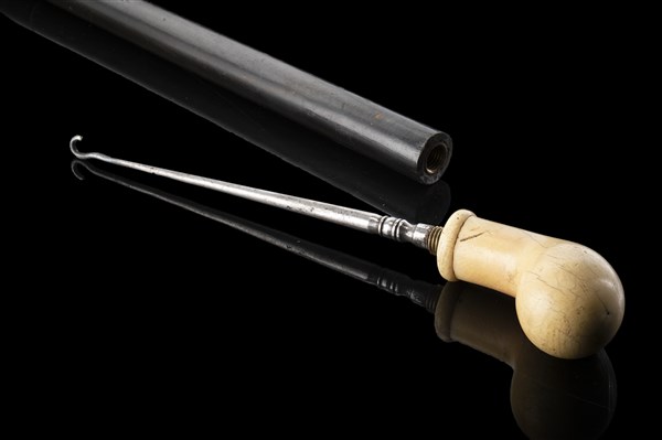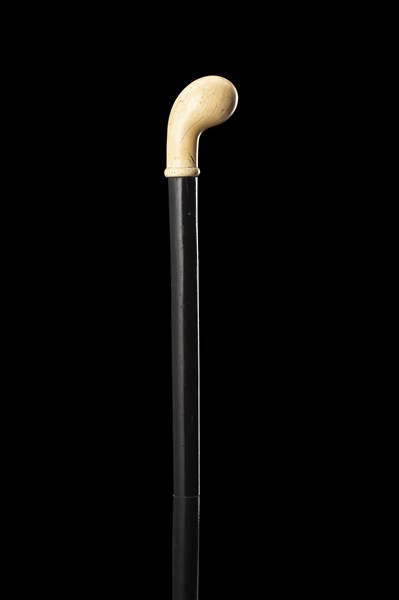 A 19th-century ebony walking stick with ivory handle enclosing a bodkin lace. Cane can be disassembled in three parts (L. cm 87)