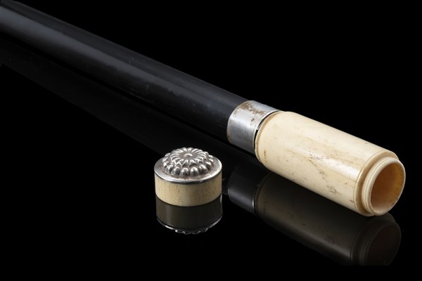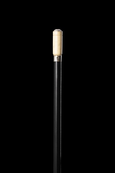 Bastone in legno ebanizzato con pomolo in avorio tornito con contenitore. Ghier