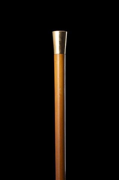 Bastone in malacca con pomolo in oro svitabile celante fiaschetta in argento. L
