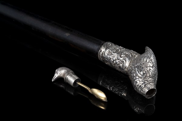 An ebony walking stick with silver quail shaped handle enclosing a bottle and a small gold spoon (L. cm 90)