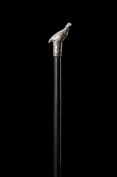 Bastone in ebano con pomolo in argento a guisa di quaglia portasali con testa s
