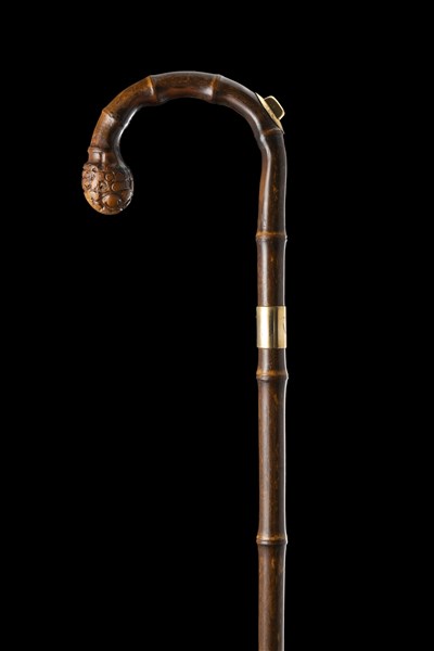 Bastone in bambù celante nell'impugnatura una matita rivestita in oro 18k. Ghiera in oro cifrata JWC e puntale in metallo. Inghilterra, inizio secolo XX (L. cm 88)