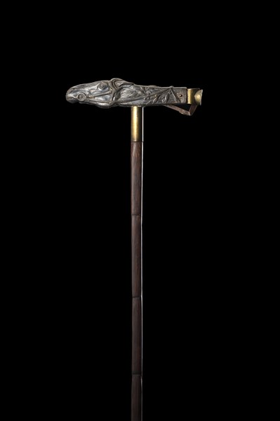 An early 20th-century bamboo walking stick with metal handle in horse head shape as cigar cutter. Brass mount (L. cm 91)