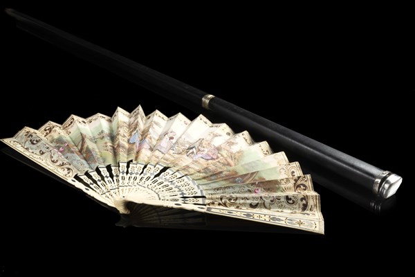 A lady’s ebony walking stick with a silver knob inscribed "Louvre" hiding a fan (L. cm 90)