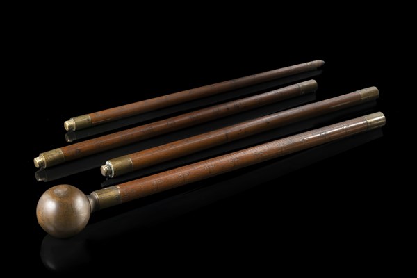 Bastone da geometra in malacca con pomolo in ottone di forma sferica svitabile con misurazione in galloni e pollici marcato "Hughes maker to the excise London". Anelli e puntale in metallo (L. cm 127)