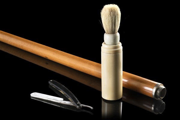 A malacca toilette stick hiding a shaving set in the ivory handle. Ciphered "BR". Metal toe cap. 19th century (L. cm 90)