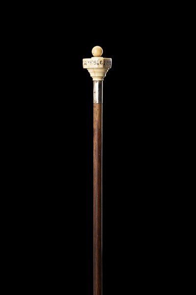 Bastone in legno con pomolo in avorio con gioco. Ghiera e puntale in argento. S