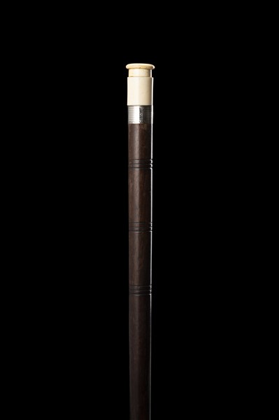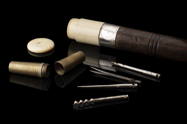 A wooden walking stick with an ivory knob hiding small tools. Silver mount engraved with an "M". Metal toe cap. 19th century (L. cm 92)