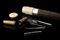 Bastone in palissandro con pomolo in avorio celante una serie di piccoli attrez