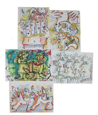 Delego Martino Titoli vari, 1989/99 N. 5 tecniche miste su carta, n.2 cm. 32,5x24, n.2 cm 24x32, n.1 cm 23,5x35,5 firmate e datate sul fronte, firmate, datate e intitolate al retro, autentiche dell'artista su foto