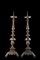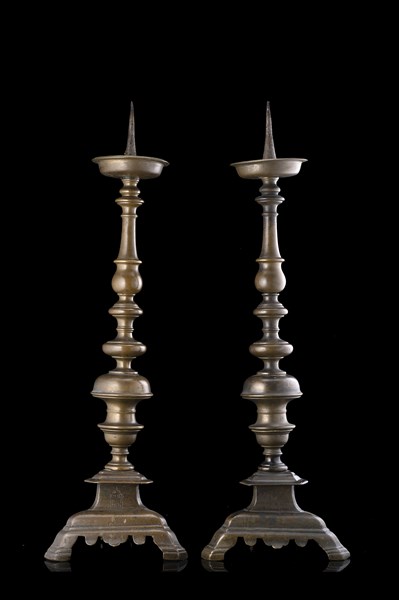 Coppia di portaceri in bronzo a rocchetto con base tripode incisa a ostensorio. Secolo XVII (h. cm 74) (lievi difetti)