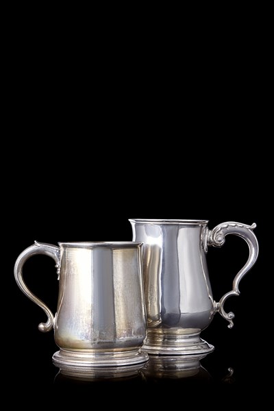 Lotto composto da due boccali diversi in argento liscio, base scanalata. Londra, secolo XVIII (h. max cm 12) (g 600)