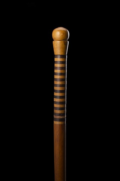 Bastone per il gioco della dama in malacca con pomolo di forma sferica svitabile celante pedine e scacchiera in tessuto. Inizio secolo XX (L. cm 88)