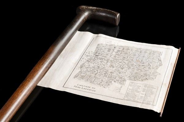 A malacca walking stick enclosing the Parisian Père-Lachaise cemetery map. Metal cap (L. cm 89)