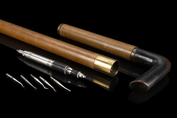 A bamboo dentist walking stick hiding tools in the handle. Tools marked The ss. white dental MFG. CO. United States, early 20th century (L. cm 93) (defects)