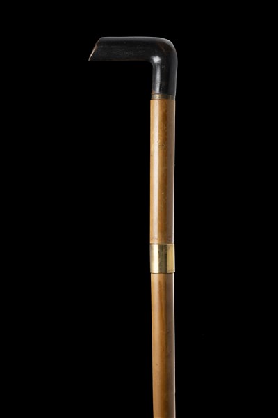 Bastone da dentista in bambù con impugnatura curva svitabile lungo l'anello in ottone celante attrezzi per la cura dei denti. Strumenti marcati The ss. white dental MFG. CO. Stati Uniti, inizio secolo XX (L. cm 93) (difetti)