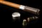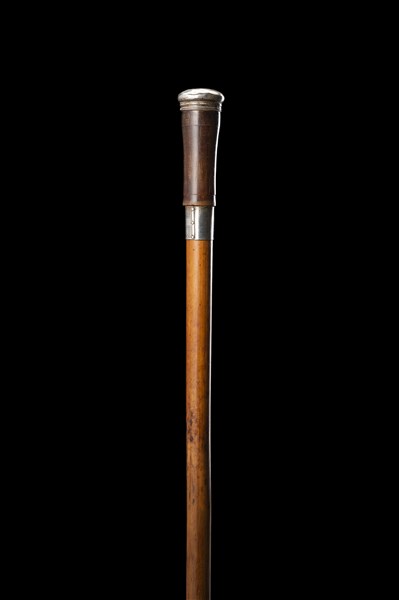 A malacca tailor walking stick hiding a thimble, a needle and some threads in the silver handle. Silver mount and toe cap. London, 1895 (L. cm 91)