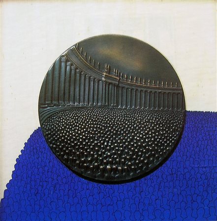 DIDASCALIA: Opera originale composta da bassorilievo in ottone diametro cm 30 realizzato a conio rifinito e patinato, presso la GDE Bertoni in tiratura limitataa trecentocinquanta esemplari numerati da 1/350 a 350/350 e venticinque esemplari numerati da I/XXV a XXV collocato secondo le indicazioni del M° Ceroli su fondo in legno realizzato in serigrafia a due colori presso la stamperia d’arte L’Incisione.