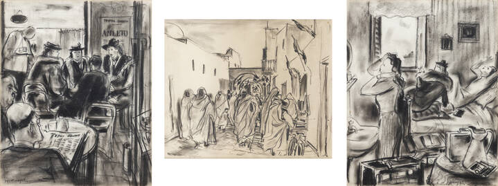 MASSIMO QUAGLINO<BR>Refrancore (AT) 1899 - 1982 Torino<BR>a."Via araba"<BR>b- "Interno di caffè"<BR>c- "Donne in albergo"