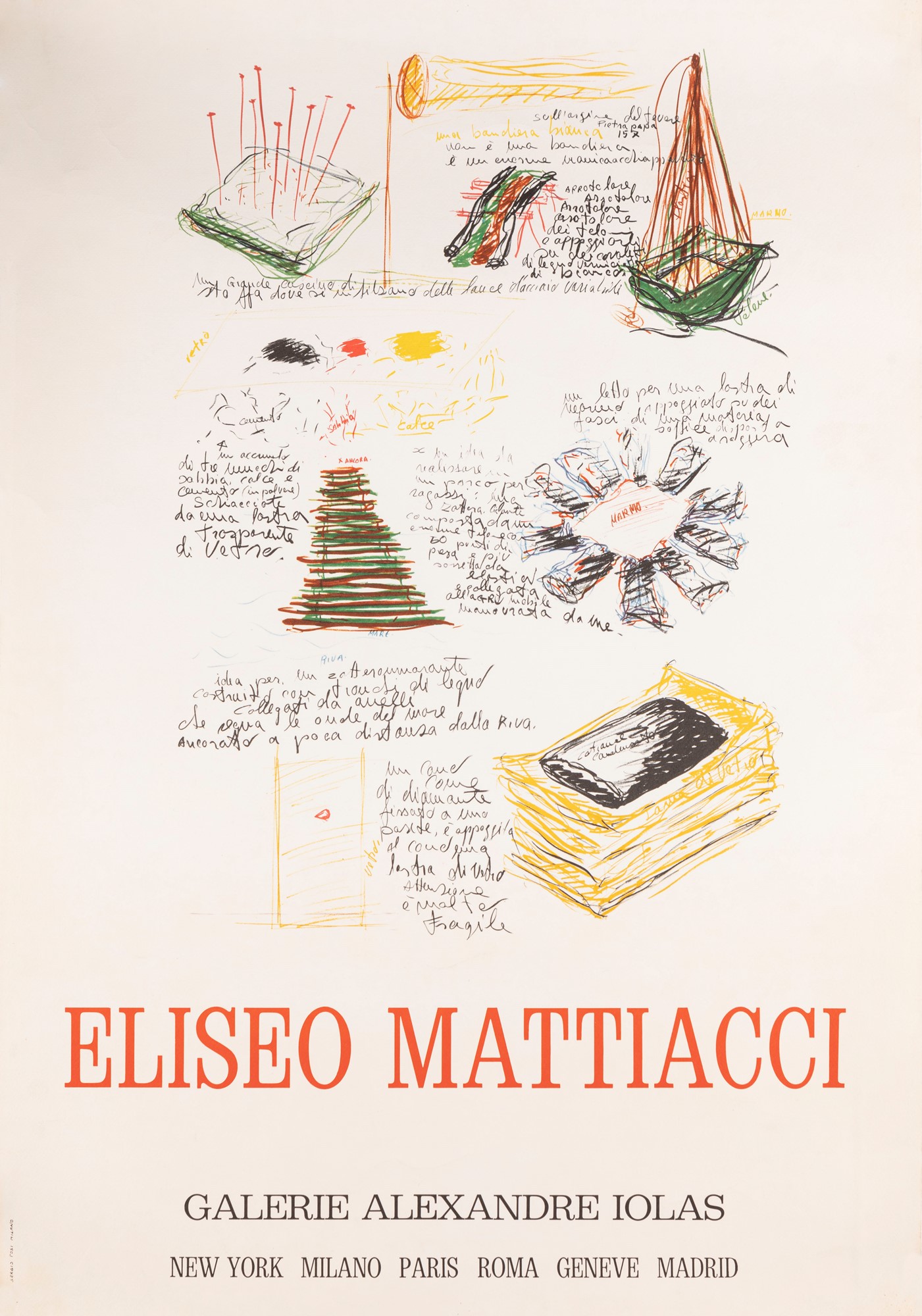 a. Eliseo Mattiacci, Galerie Alexandre Iolas, New York, Milano, Paris, Roma, Geneve, Madrid, 1969, manifesto della mostra, cm 85 x 59,5 (misure del foglio), (sc)