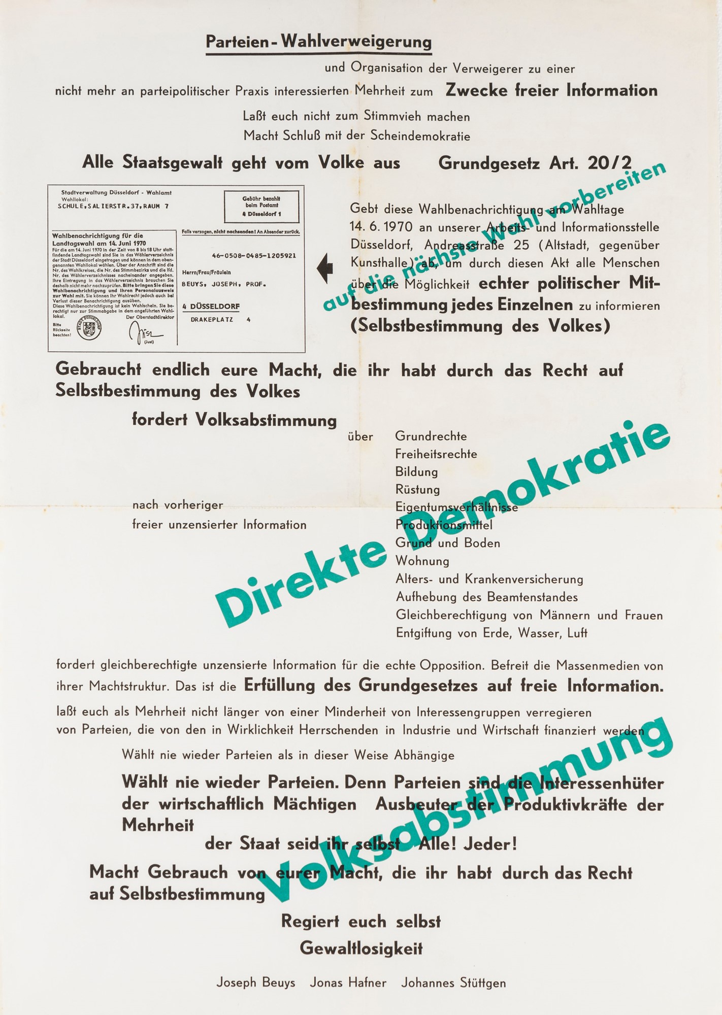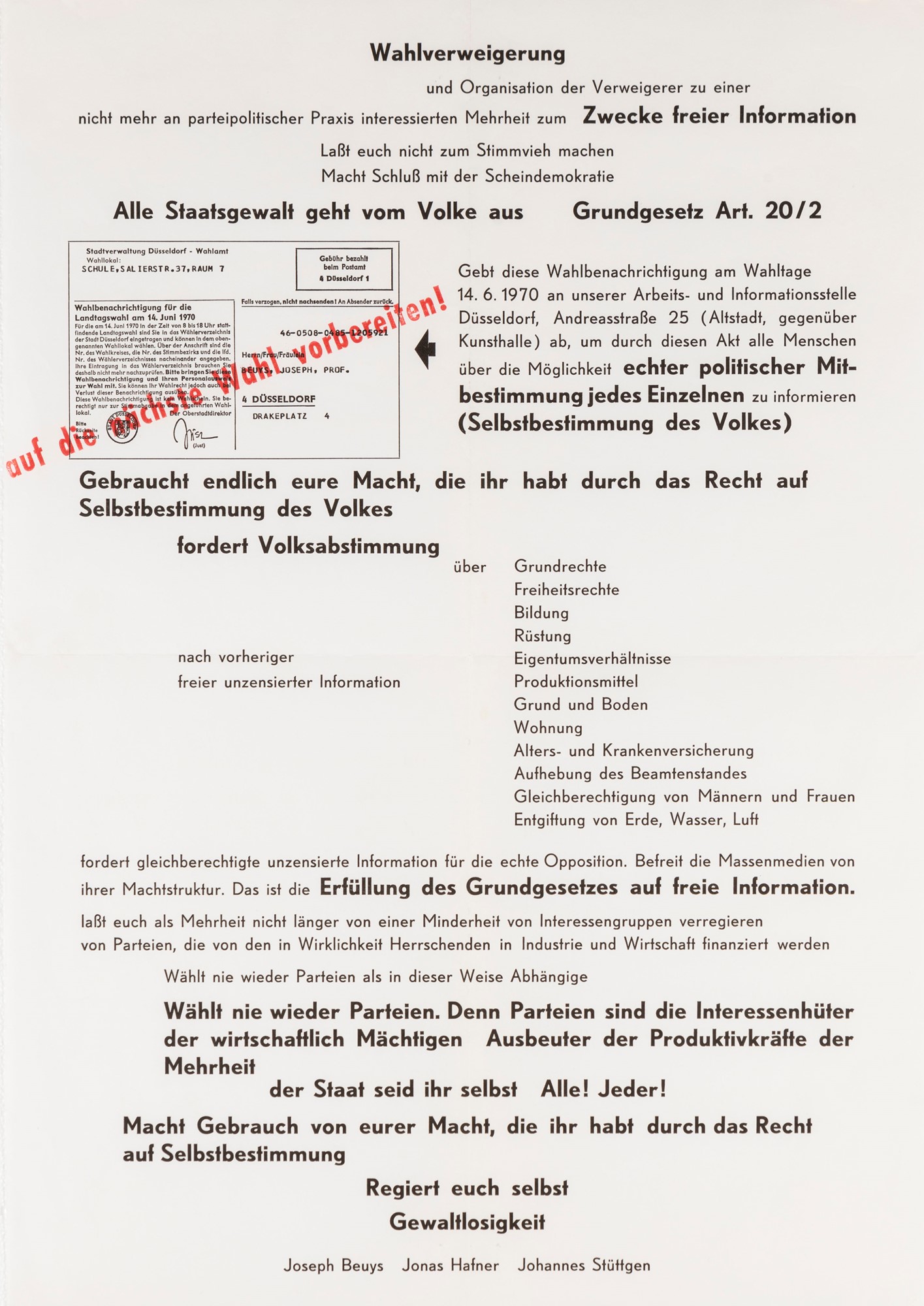 Manifesto degli"astensionisti" organizzati contro la burocrazia e la partitocrazia in occasione delle elezioni politiche del 14 giugno 1970 in Germania, sottoscritto da Beuys e due suoi studenti. Quella degli «astensionisti» sulla seconda organizzazione politica creata da Beuys, dopo il "Partito tedesco degli studenti" del 1967.