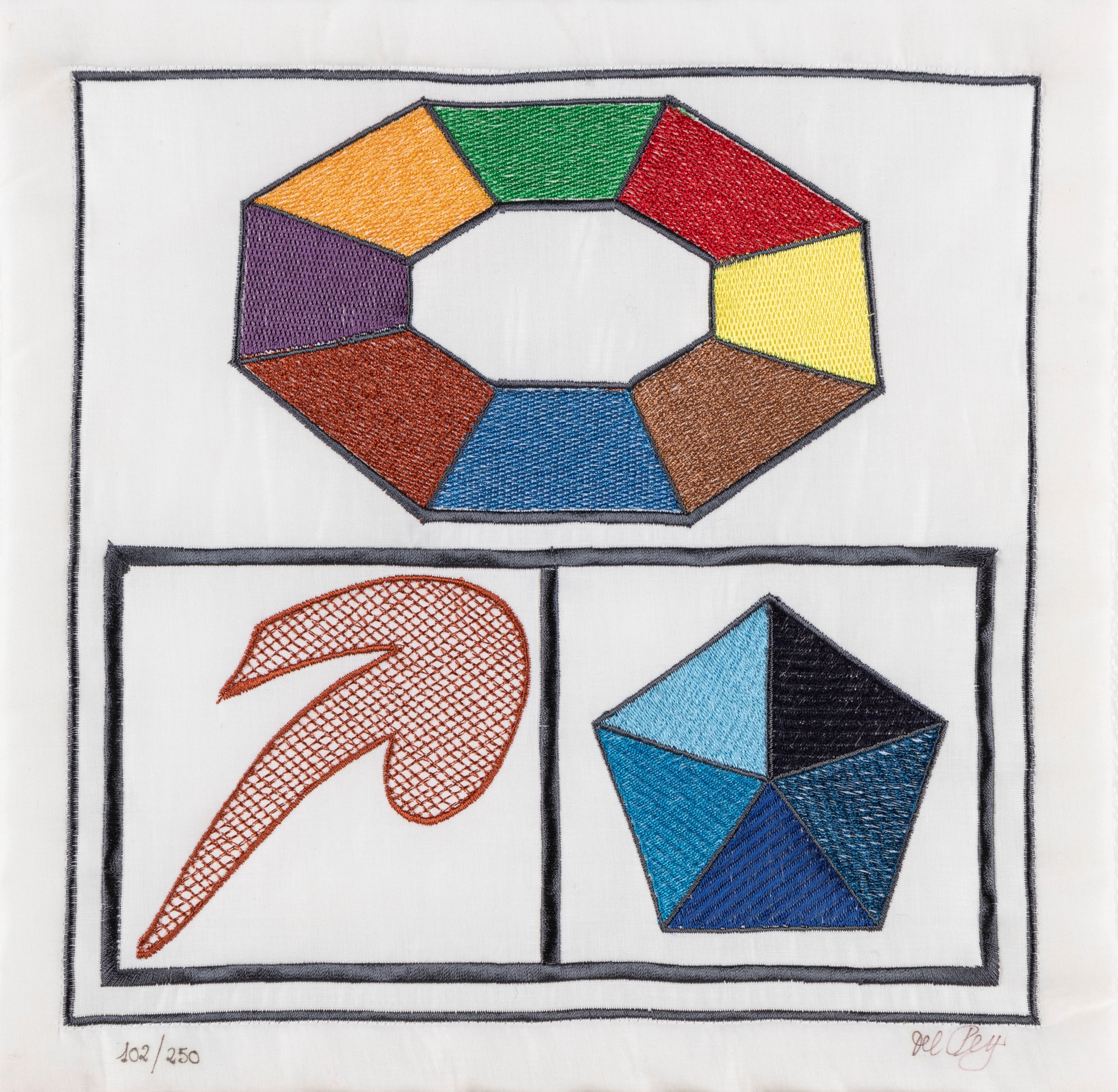 a. Anello cromatico, 1991, arazzo ricamato e matelassato, es. 102/250, cm 32,5 x 32,5, firma in basso a destra