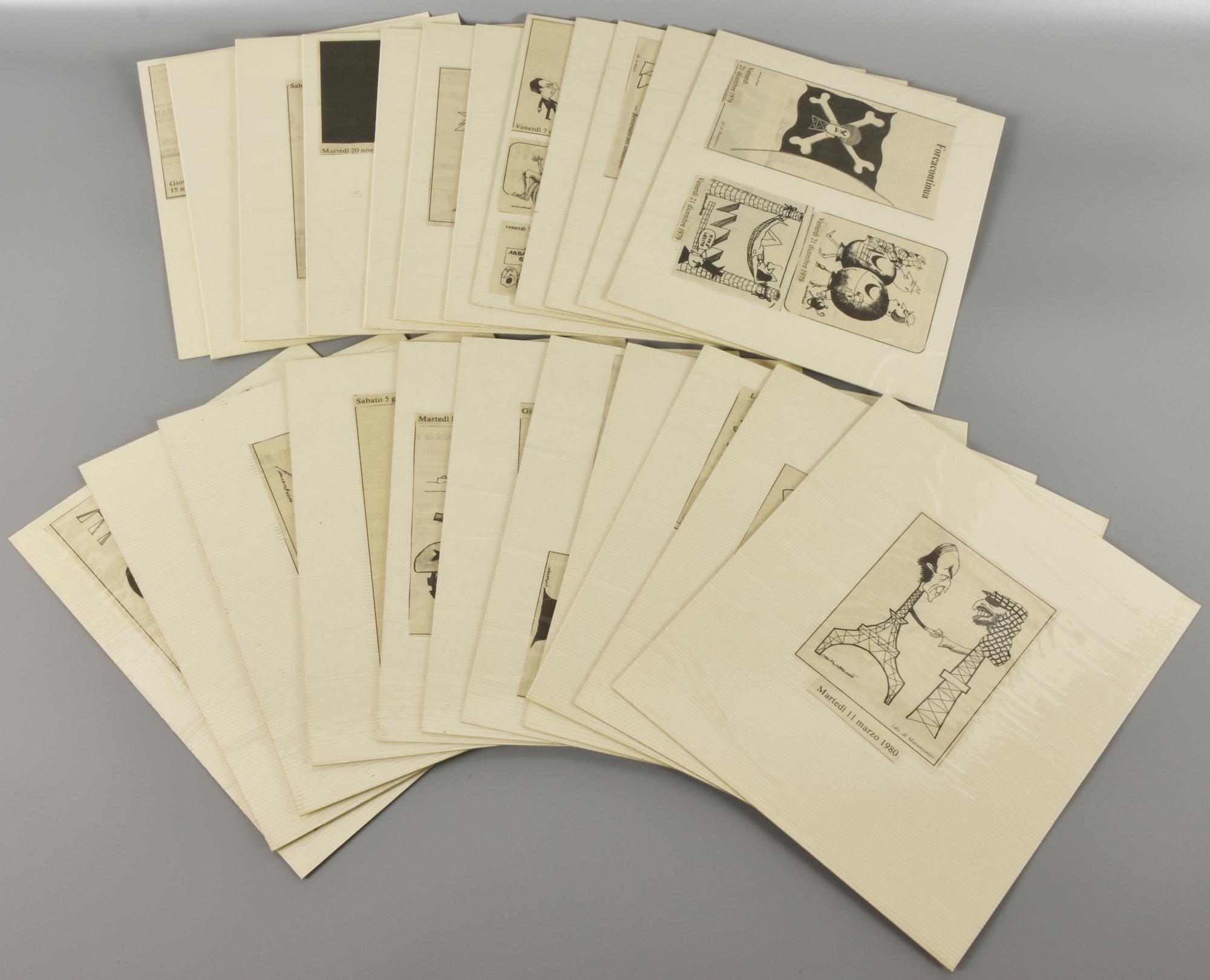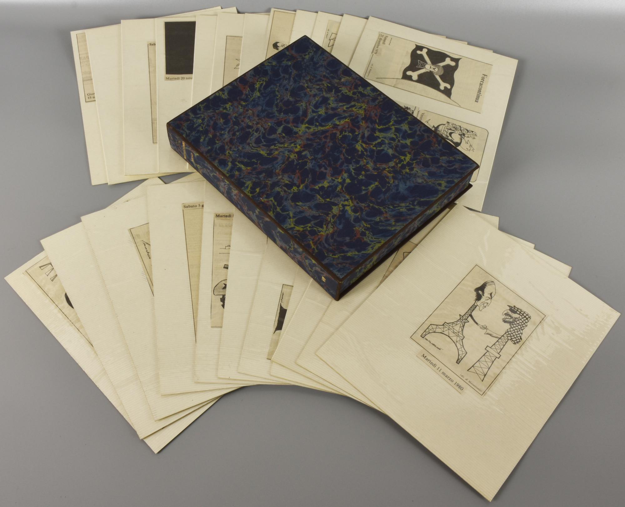 cofanetto di vignette satiriche ritagliate da "Il giornale" e incollate su 23 cartoncini, cofanetto cm 27x21,5x4, cartoncini cm 25x20
