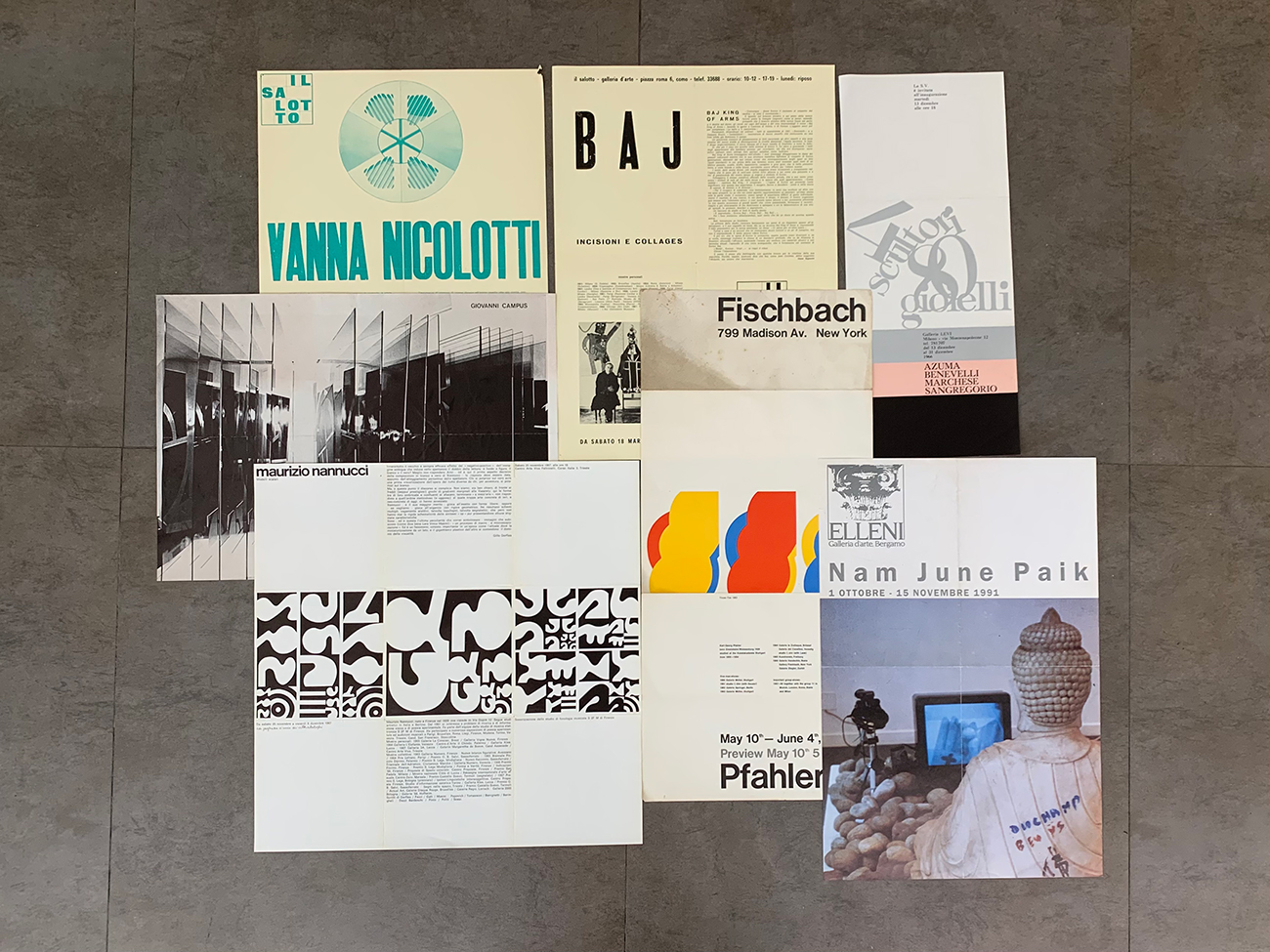 40 tra manifesti ed inviti di artisti vari (Nicolotti, Baj, Campus, Fishback, Azuma etc...) inerenti mostre ed eventi