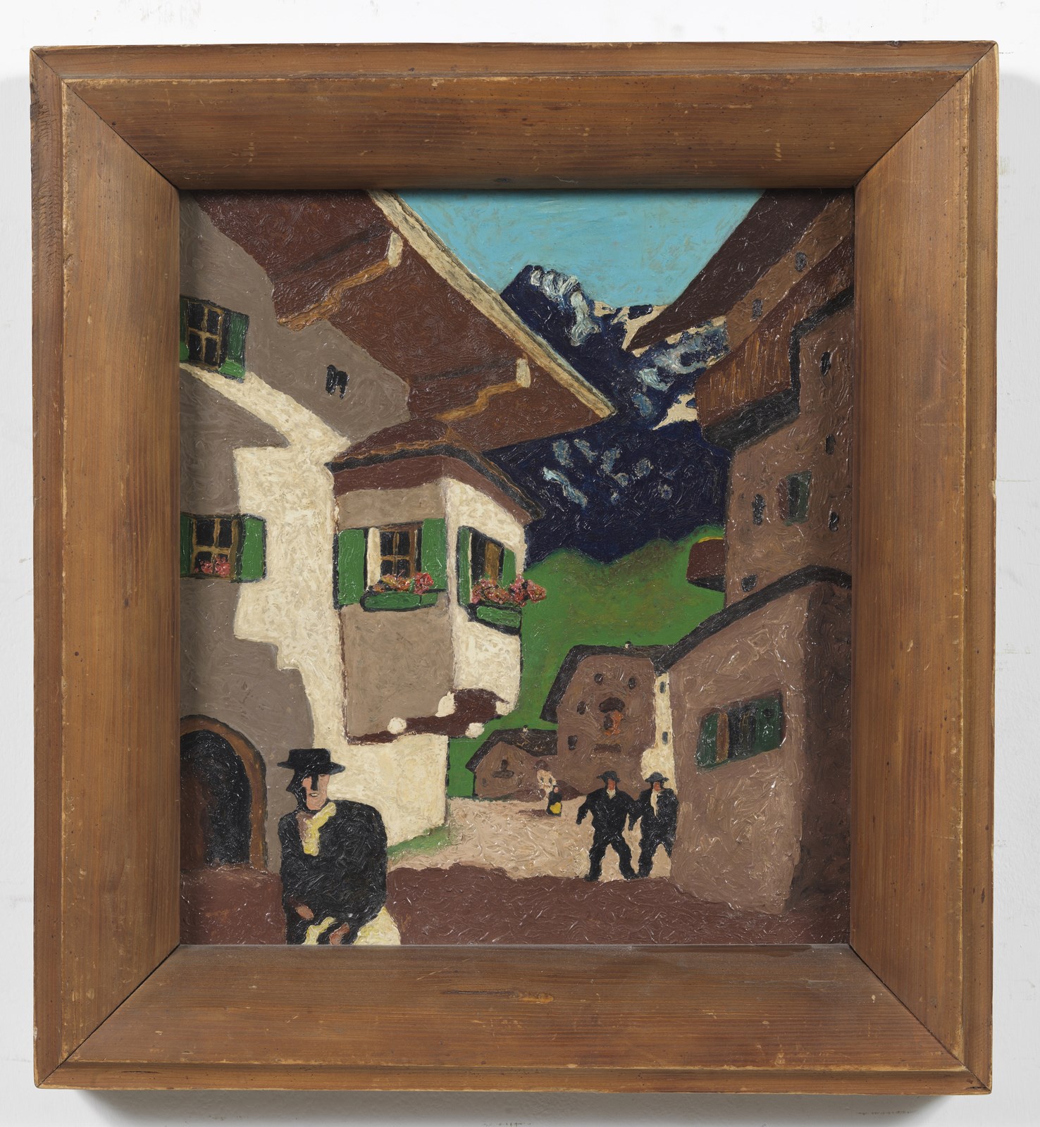 ARTISTA DEL XX SECOLO Paesaggio montano con case e personaggi. . Olio su cartone pressato. Cm 30,50 x 34,50. . Cornice presente