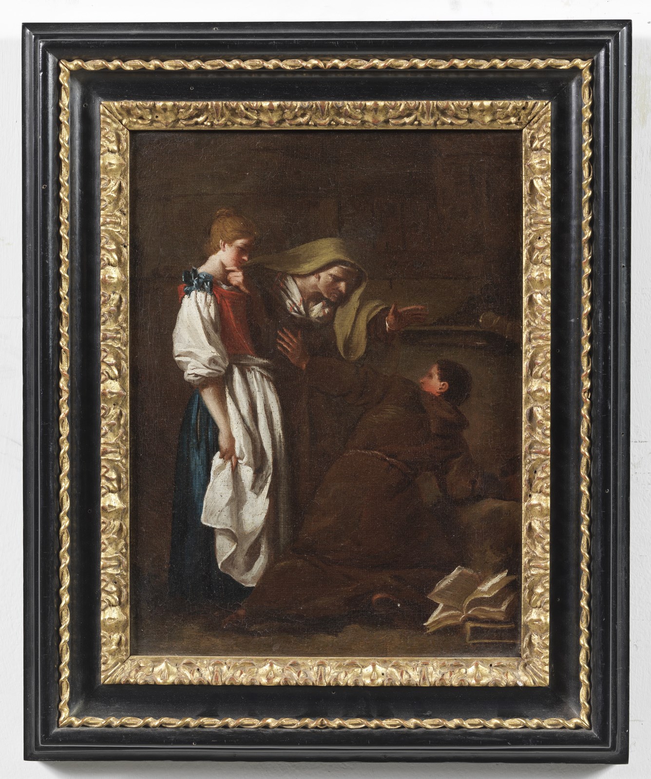ARTISTA DEL XVII SECOLO Scena d'interno con frate e personaggi. . Olio su tela . Cm 22,50 x 30,50. . Cornice presente