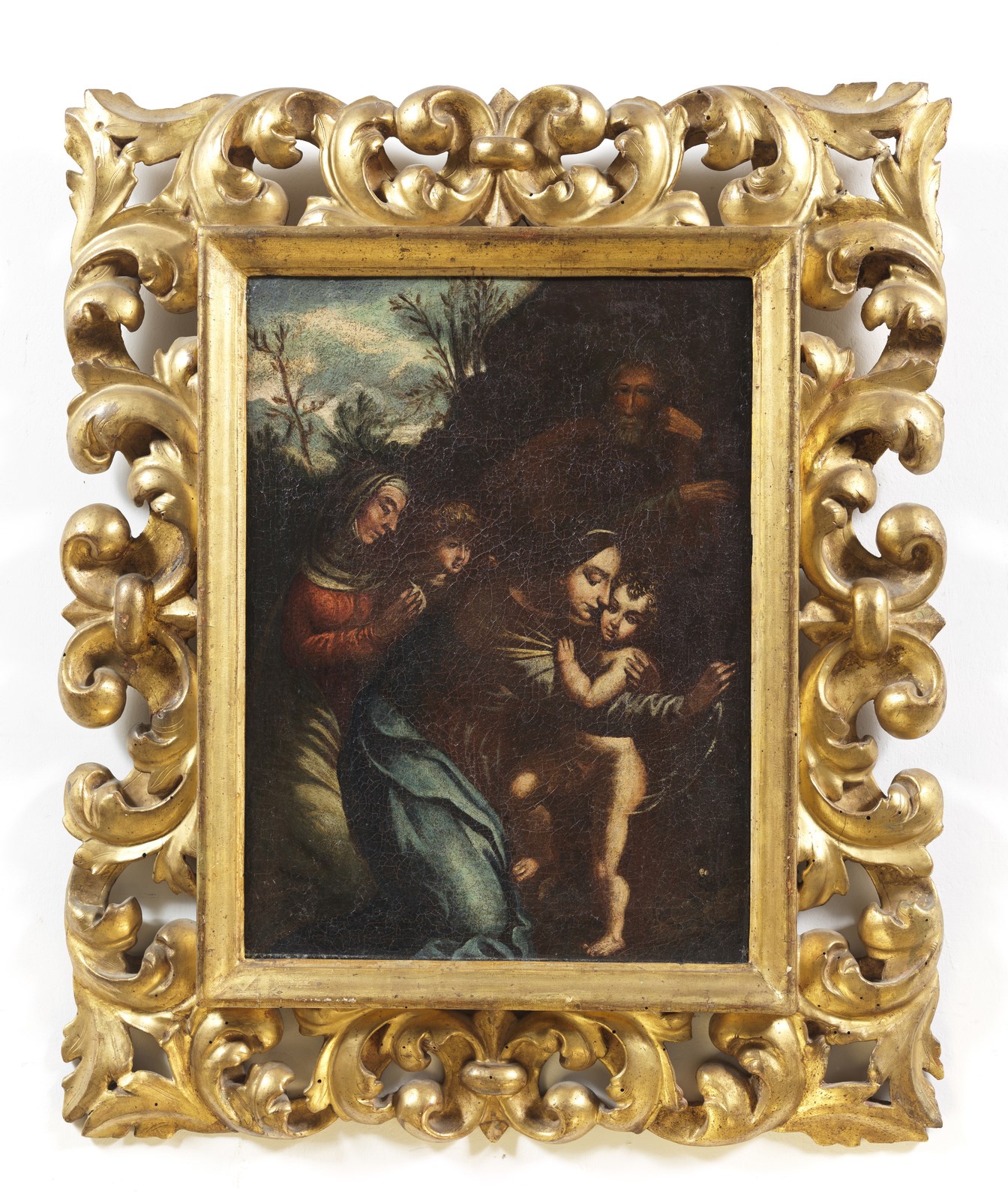 ARTISTA DEL XVII SECOLO Madonna con bambino, San Giuseppe, San Giovannino e Santa Elisabetta. . Olio su tela . Cm 29,00 x 39,50. . Cornice presente