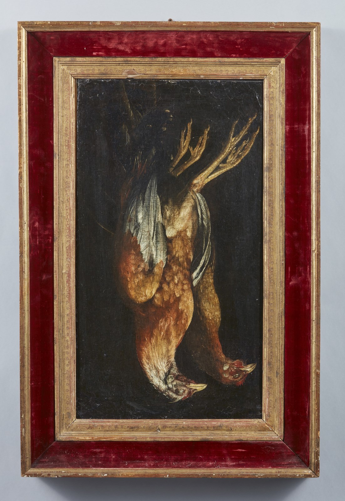 CRIVELLI ANGELO MARIA DETTO IL CRIVELLONE (1650 - 1730) Attribuito a. Natura morta con cacciagione. . Olio su tela . Cm 33,50 x 62,00. Al retro cartiglio espositivo Mostra dei tesori d'arte di Lombardia - Zurigo, Kunsthaus, ottobre 1948-marzo 1949. . Cornice presente
