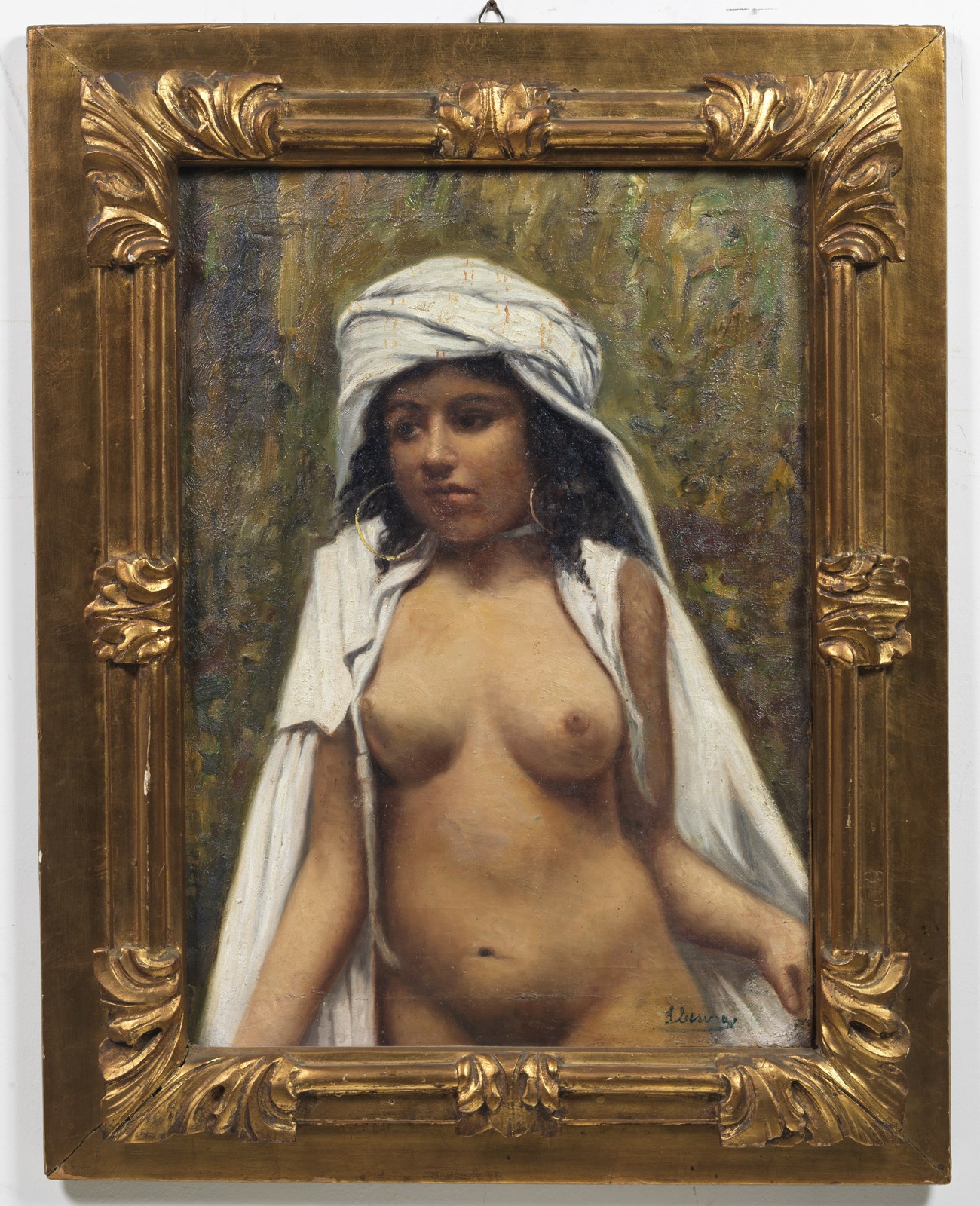 PITTORE ORIENTALISTA DEL XIX SECOLO Ritratto di giovane. Olio su tela . Cm 50,00 x 69,50. Firma illeggibile in basso a destra. . Cornice presente