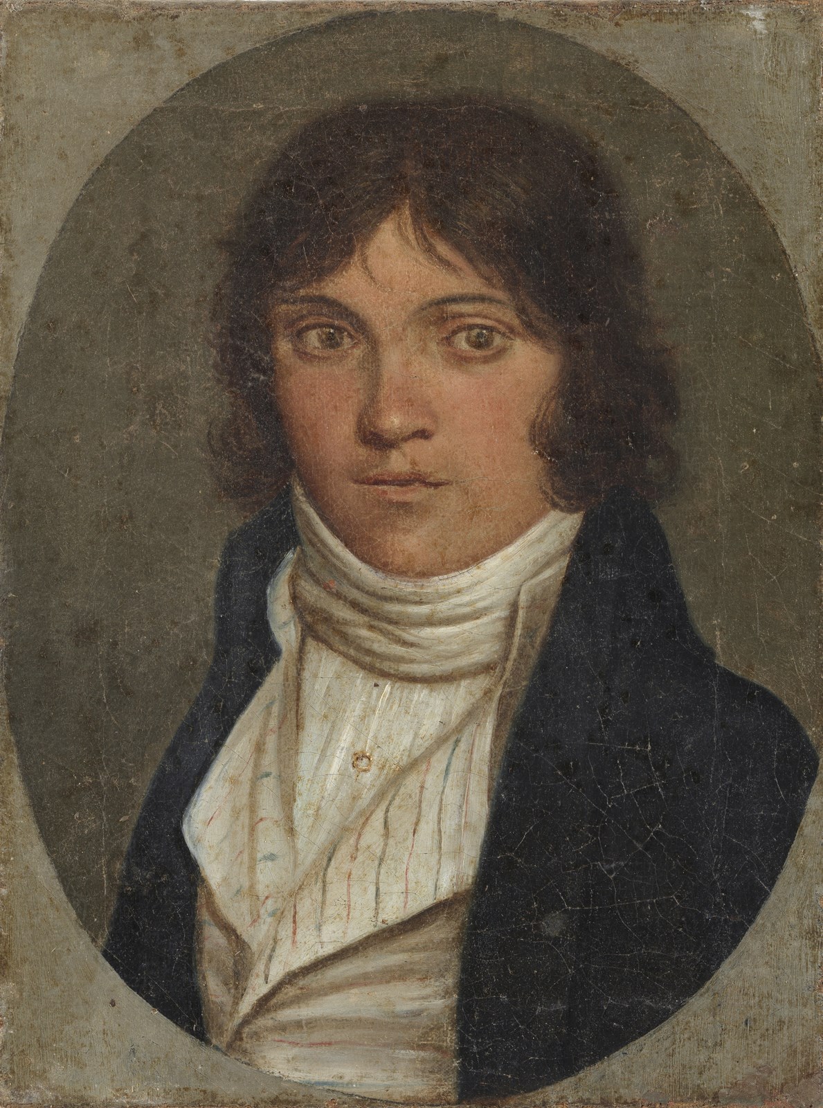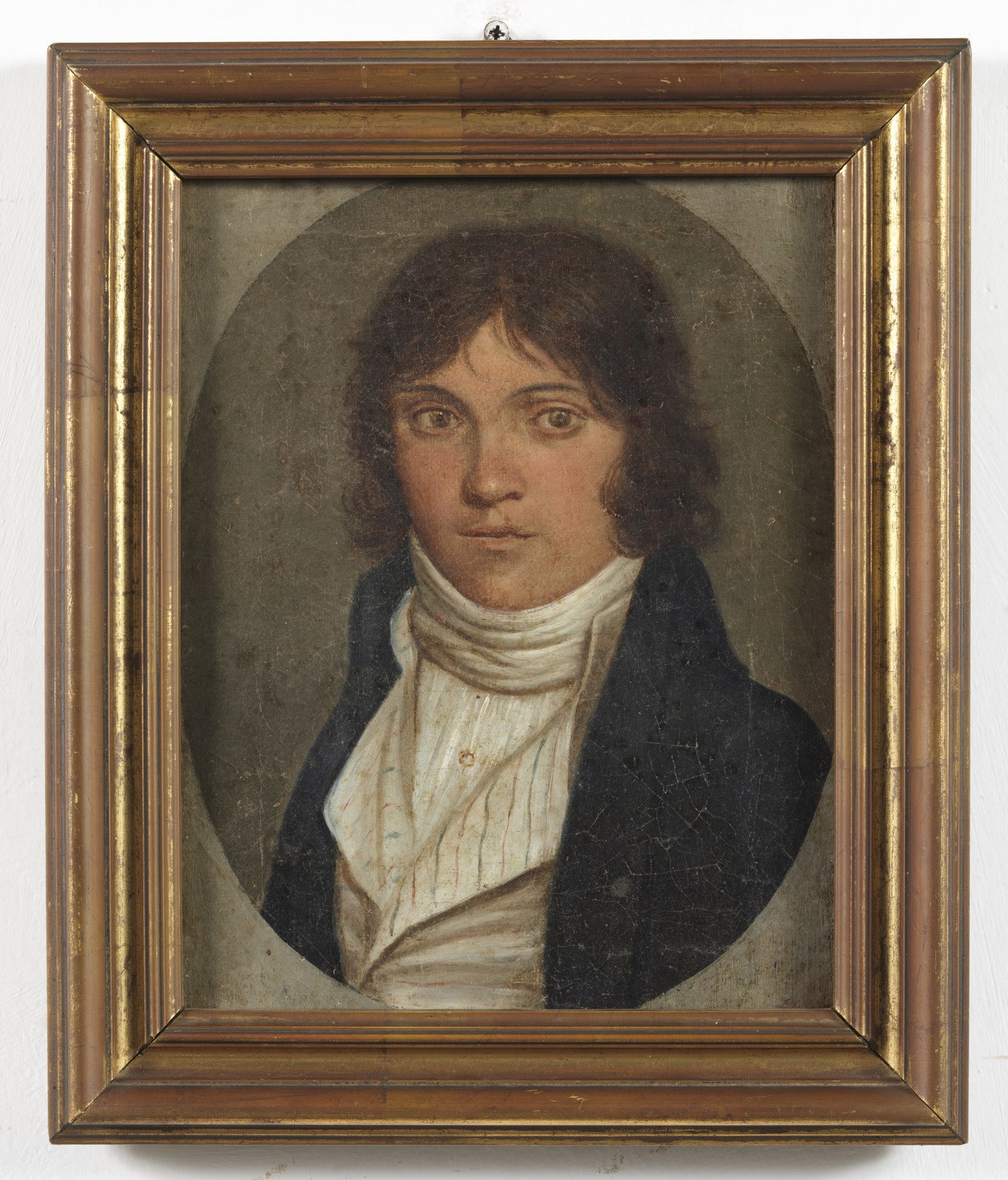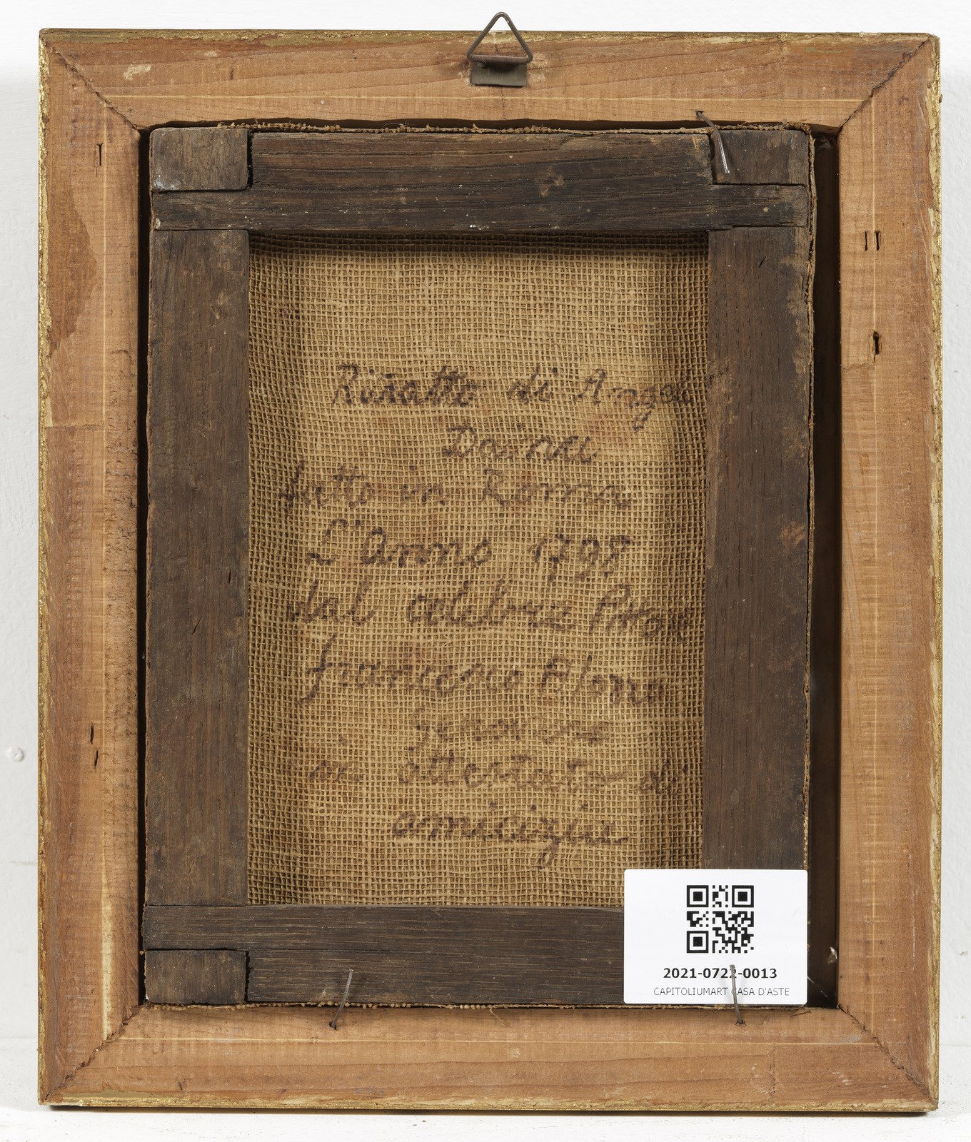 ARTISTA DEL XIX SECOLO Ritratto di Angelo Daini. . Olio su carta su tela. Cm 19,00 x 26,00. Al retro riporta dicitura: " Angelo Daini fatto in Roma l'anno 1798 dal celebre pittore Francesco ... in attestato di amicizia". Cornice presente