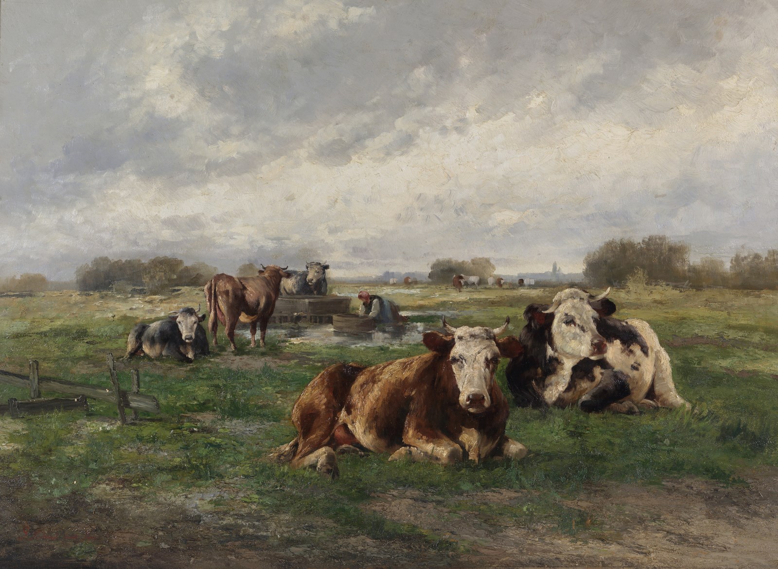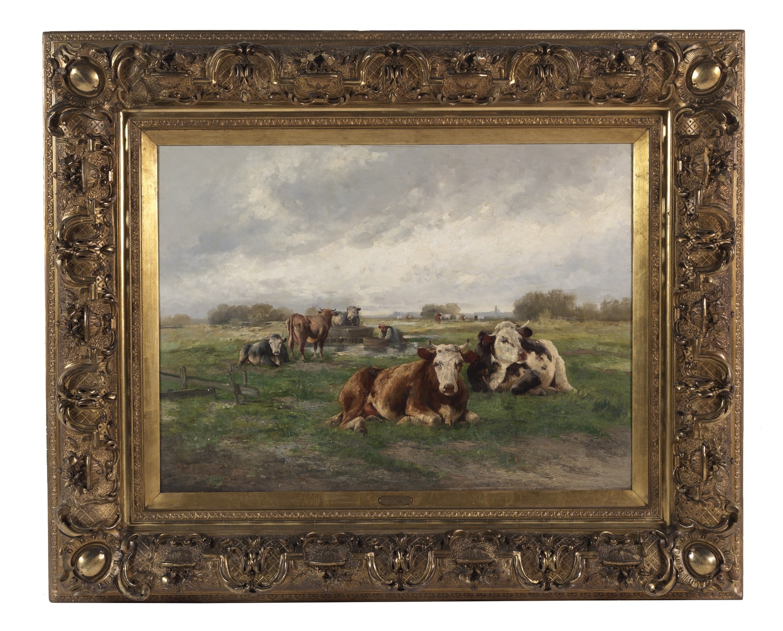 ARTISTA DEL XIX SECOLO Mucche al pascolo con Montmartre sullo sfondo. Olio su tela . Cm 110,00 x 80,00. Firmato in basso a sinistra e indicato Paris. Cornice presente