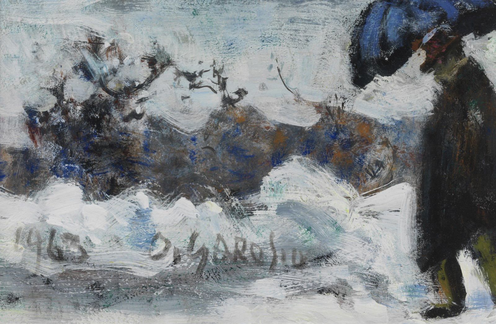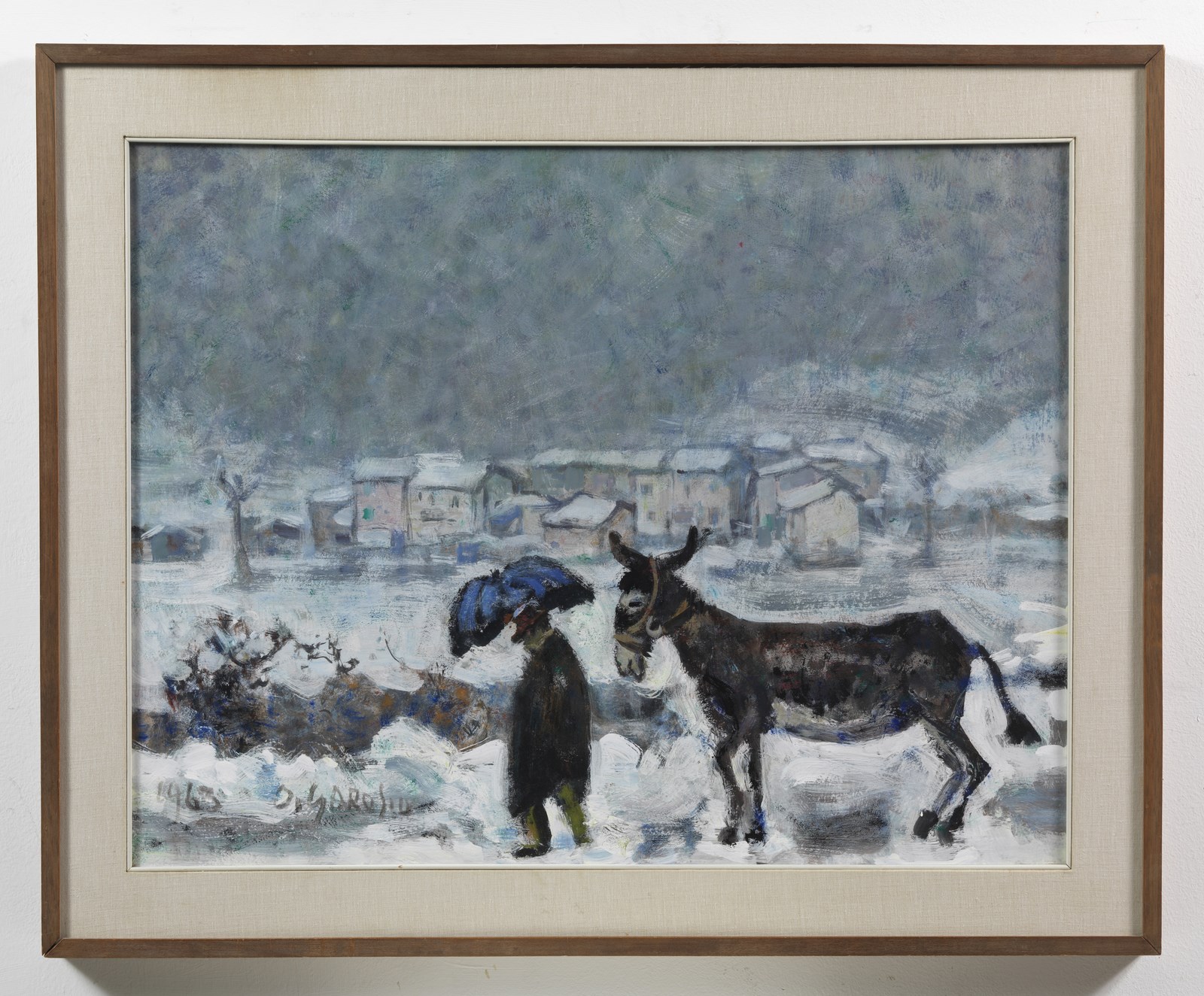 GAROSIO OTTORINO (1904 - 1980) Paesaggio invernale con asino e personaggio. Olio su compensato. Cm 73,00 x 57,50. Firmato e datato 1963 in basso a sinistra. . Cornice presente