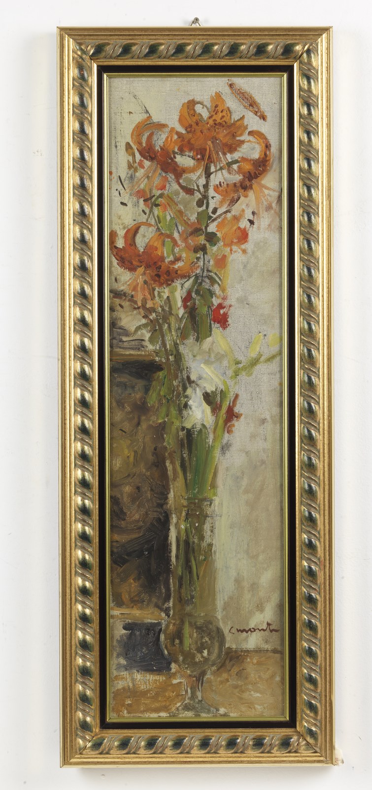 MONTI CESARE (1891 - 1959) Natura morta di fiori. . Olio su tela . Cm 22,00 x 75,00. Firmato in basso a destra. Cornice presente