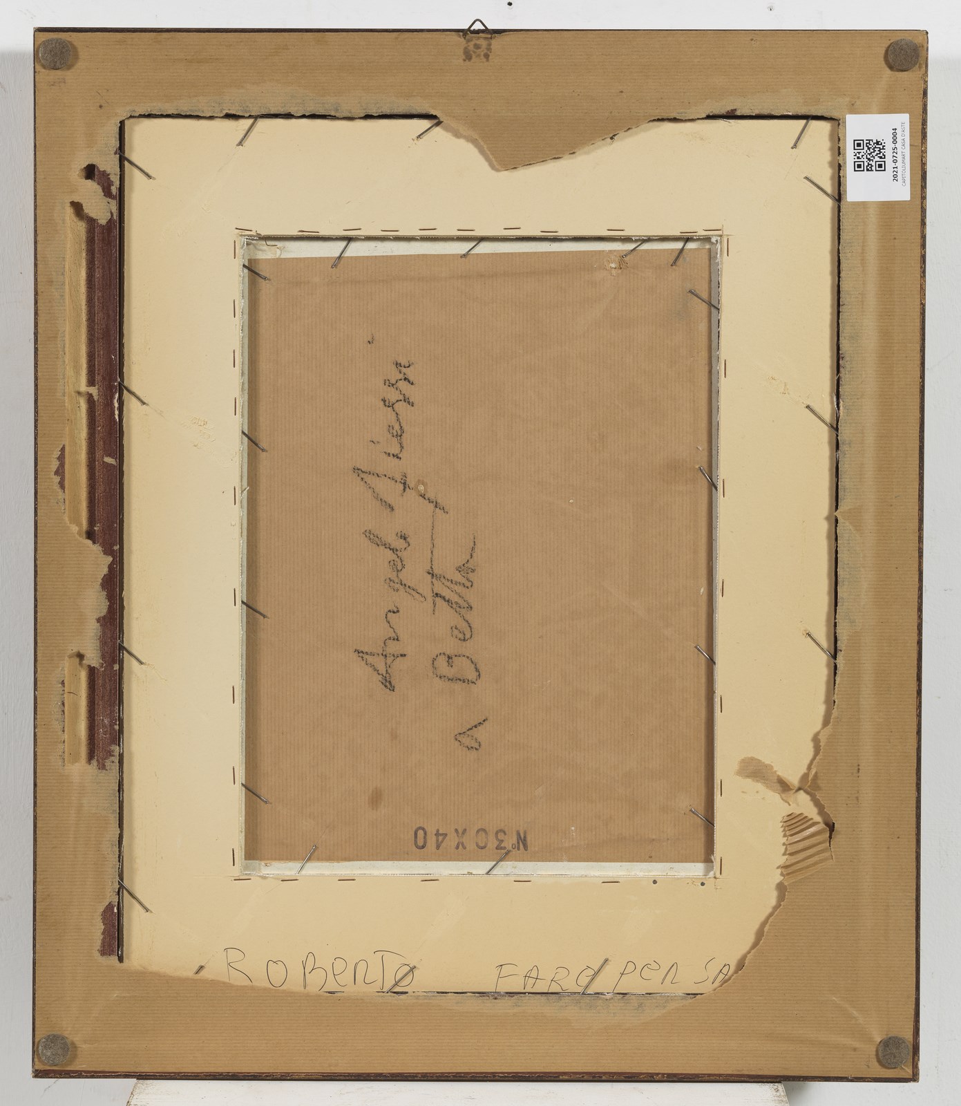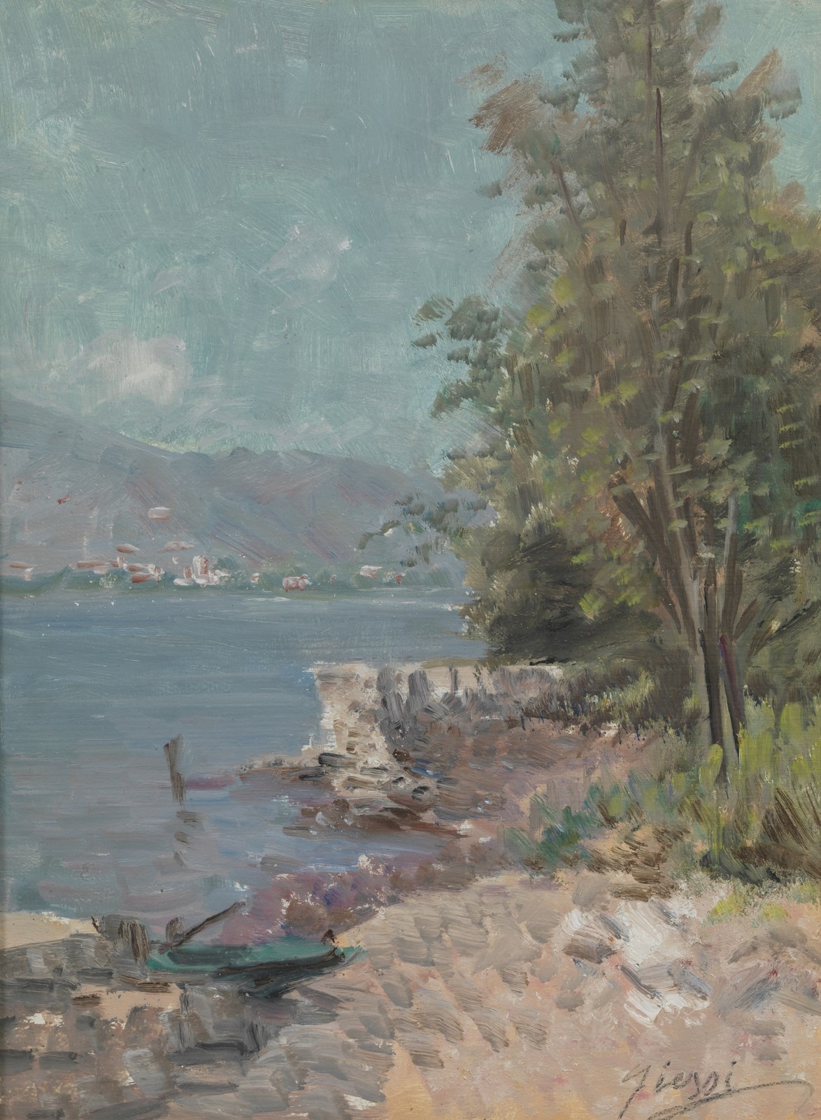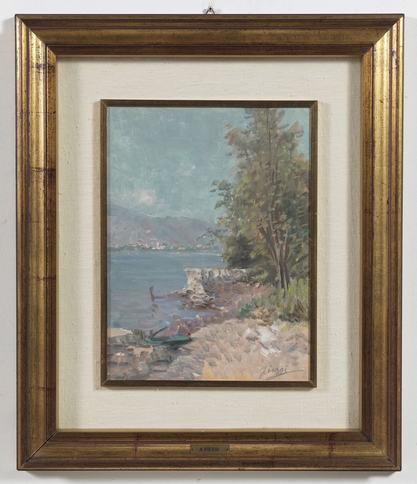 FIESSI ANGELO (1891 - 1977) Paesaggio lagunare. . Olio su cartone pressato. Cm 29,00 x 40,00. Firmato in basso a destra. Al retro firmato e dedicato. . Cornice presente