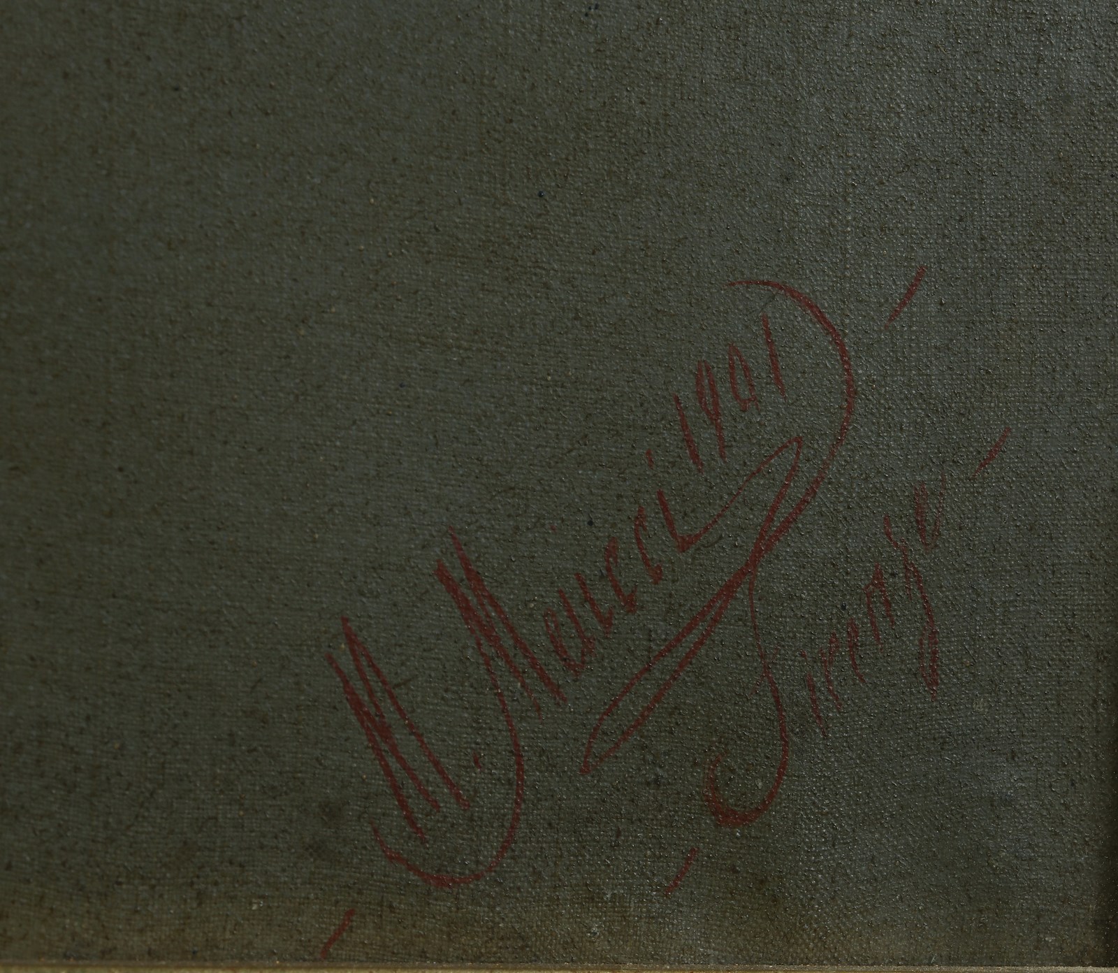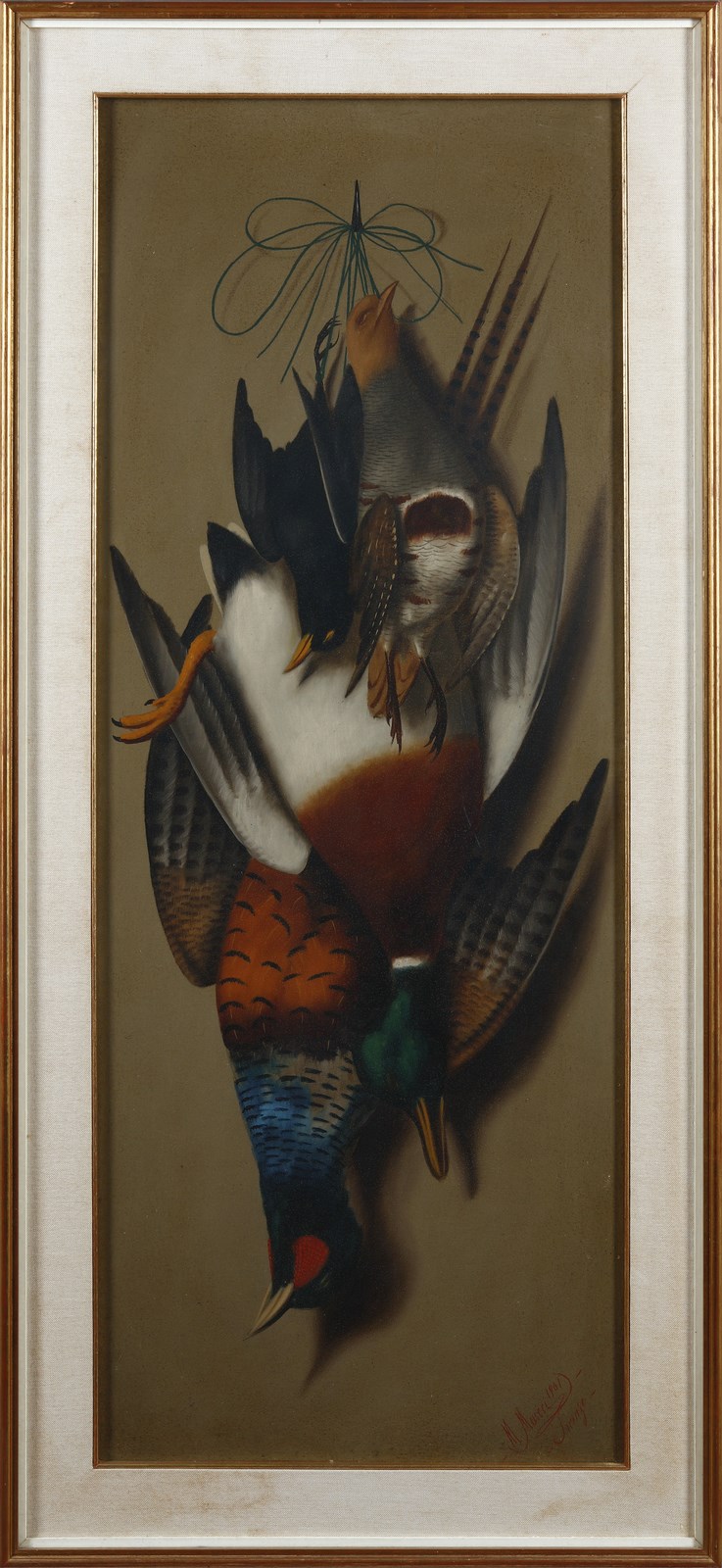 MEUCCI MICHELANGELO (1840 - 1909) Natura morta con cacciagione. . Olio su tela . Cm 40,00 x 101,00. Firmato e datato 1901 in basso a destra. Cornice presente