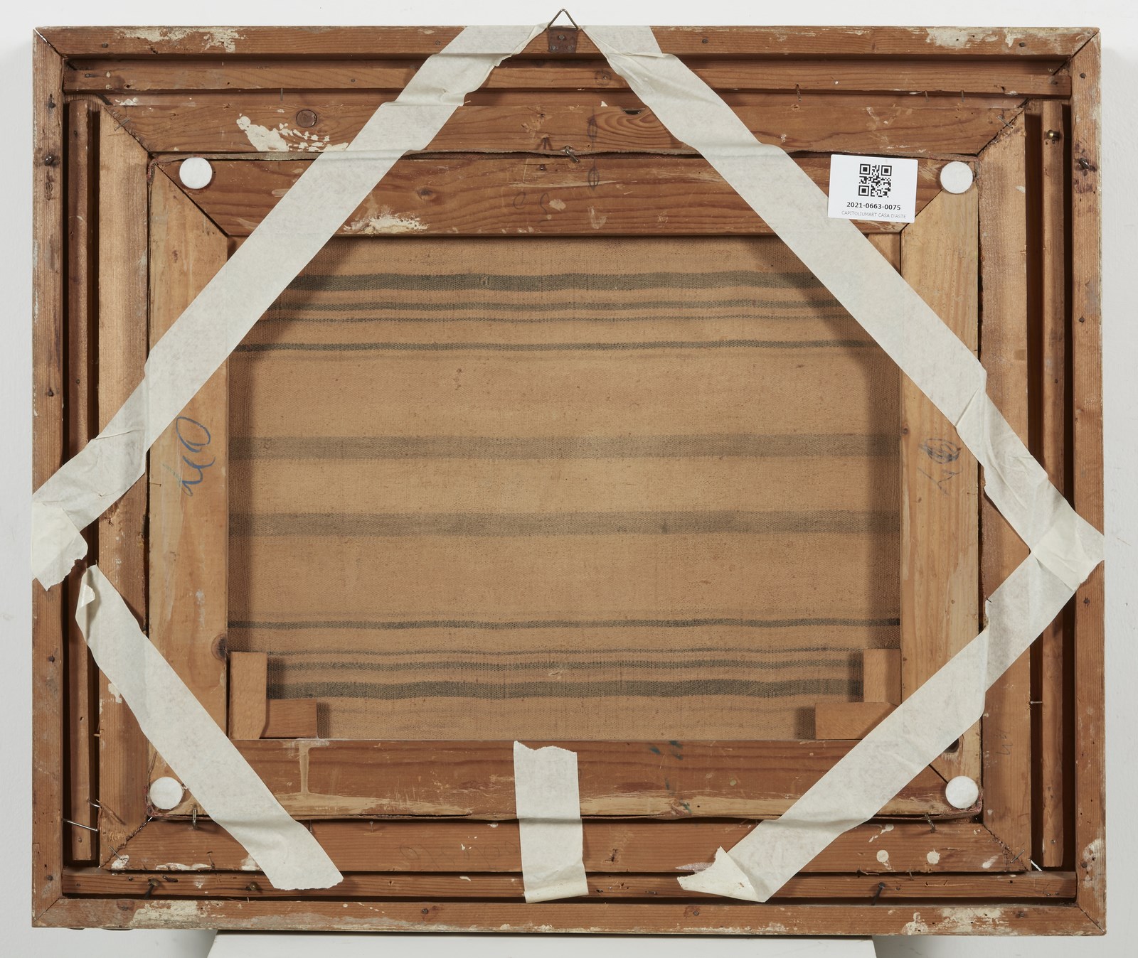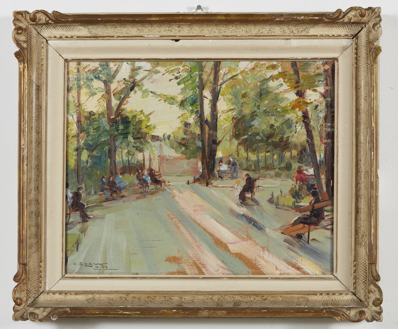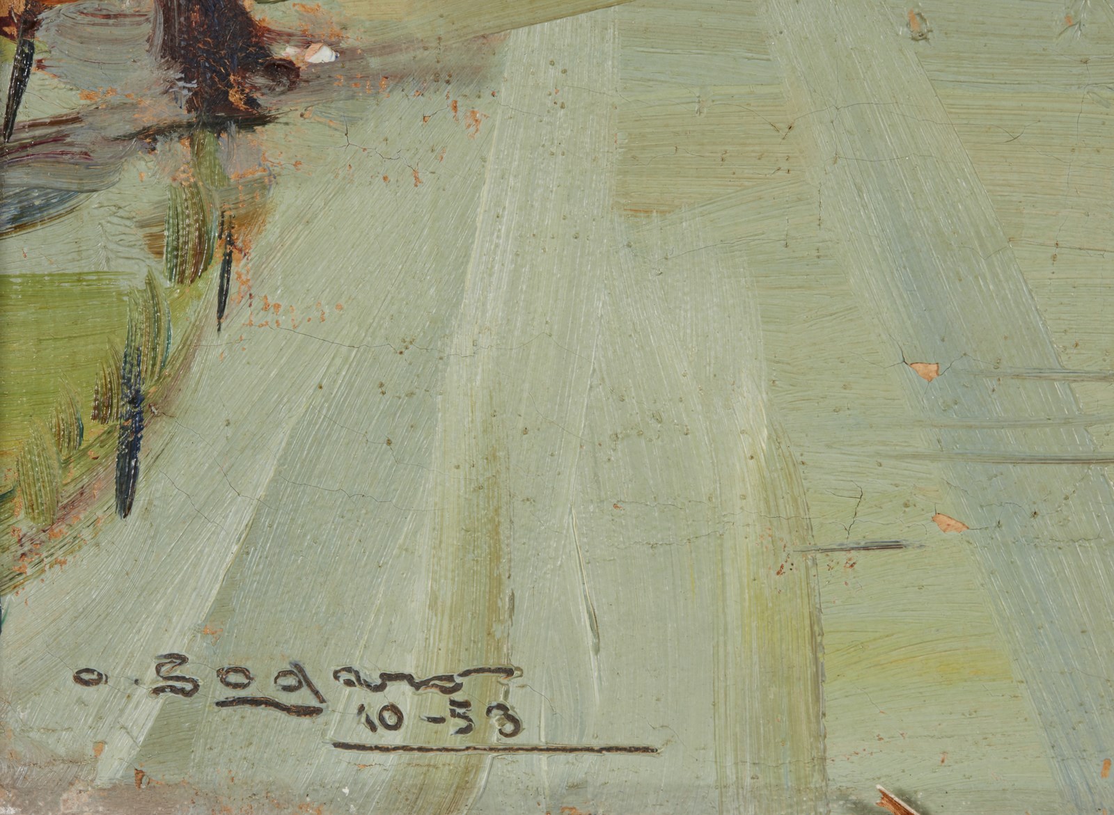 SOGARO OSCAR (1888 - 1967) Paesaggio con personaggi. . Olio su tela . Cm 49,50 x 41,50. Firmato e datato 1953 in basso a sinistra. . Cornice presente
