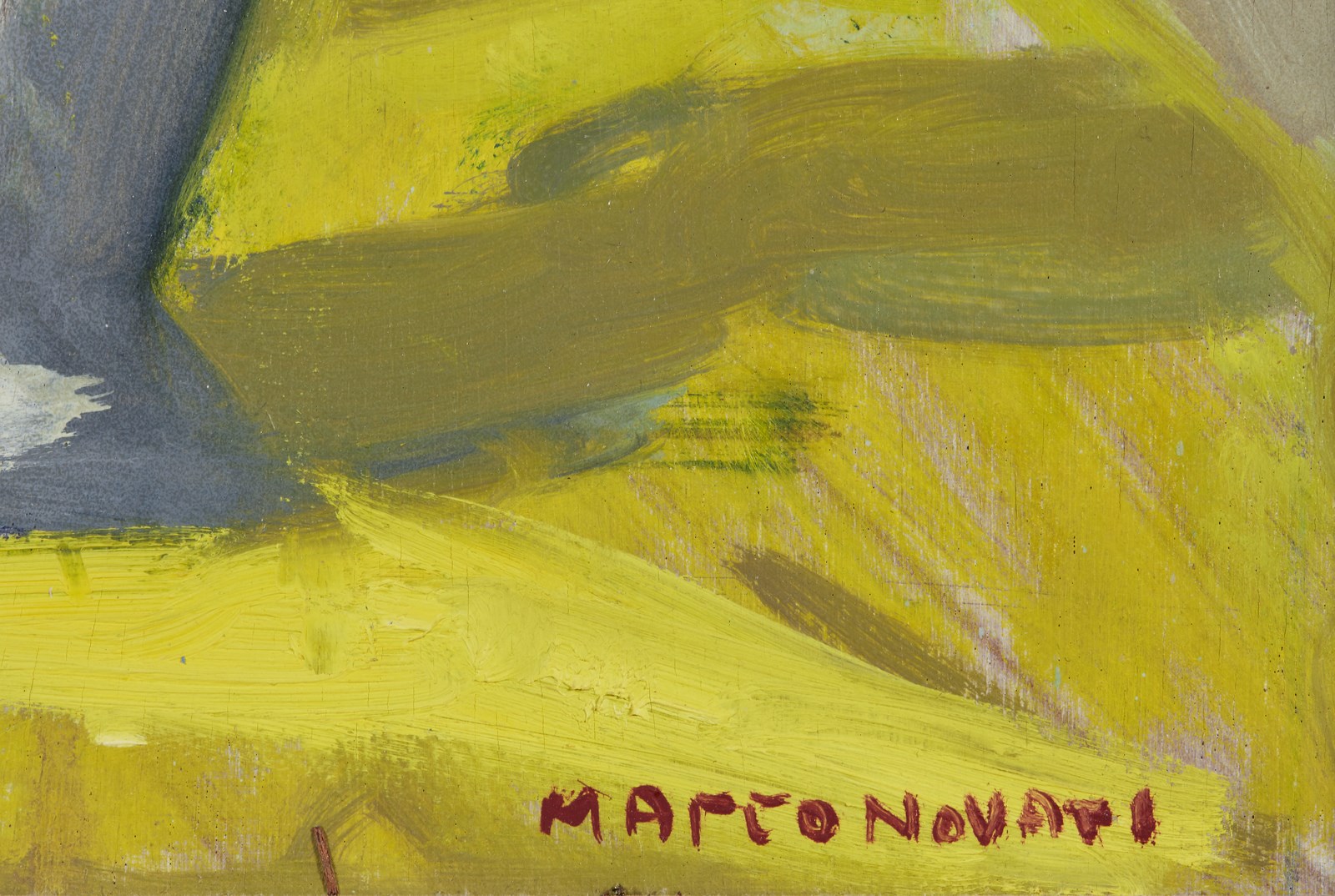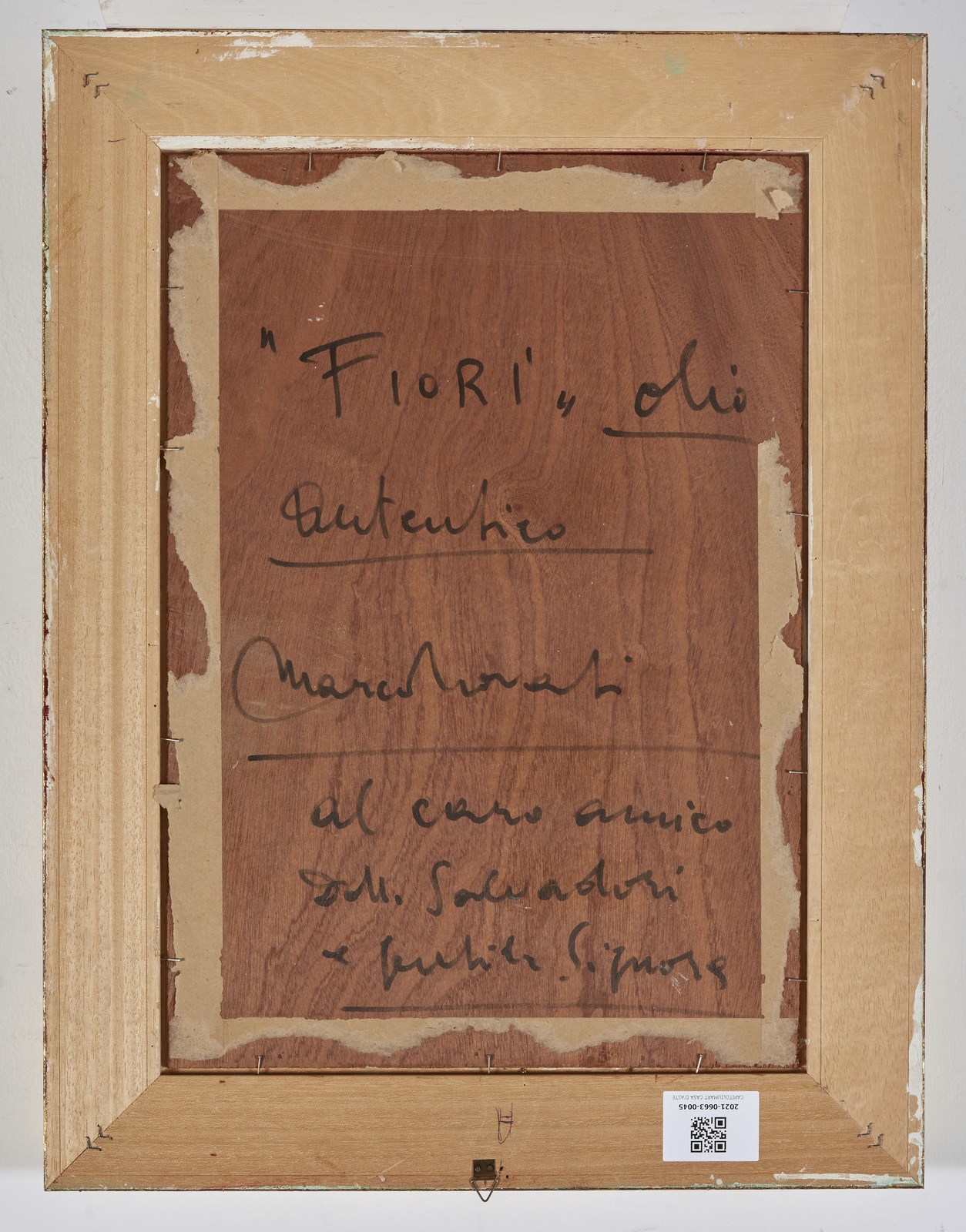 NOVATI MARCO (1895 - 1975) Fiori. Olio su tavola. Cm 35,00 x 50,50. Firmato in basso a destra. Al retro intitolato, firmato e dedicato. . Cornice presente