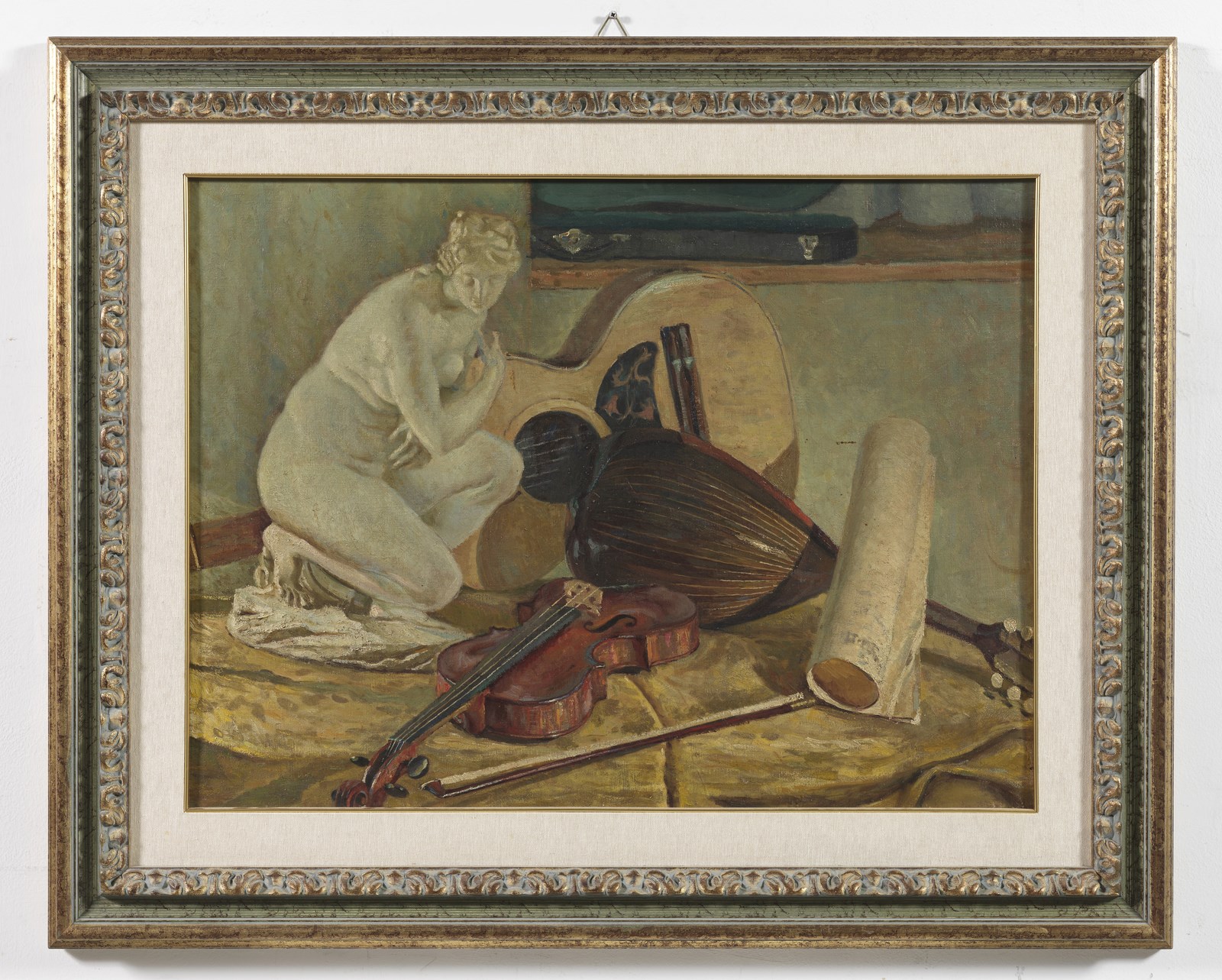 ARTISTA DEL XIX-XX SECOLO Natura morta con strumenti musicali. . Olio su tela . Cm 81,00 x 60,50. . Cornice presente