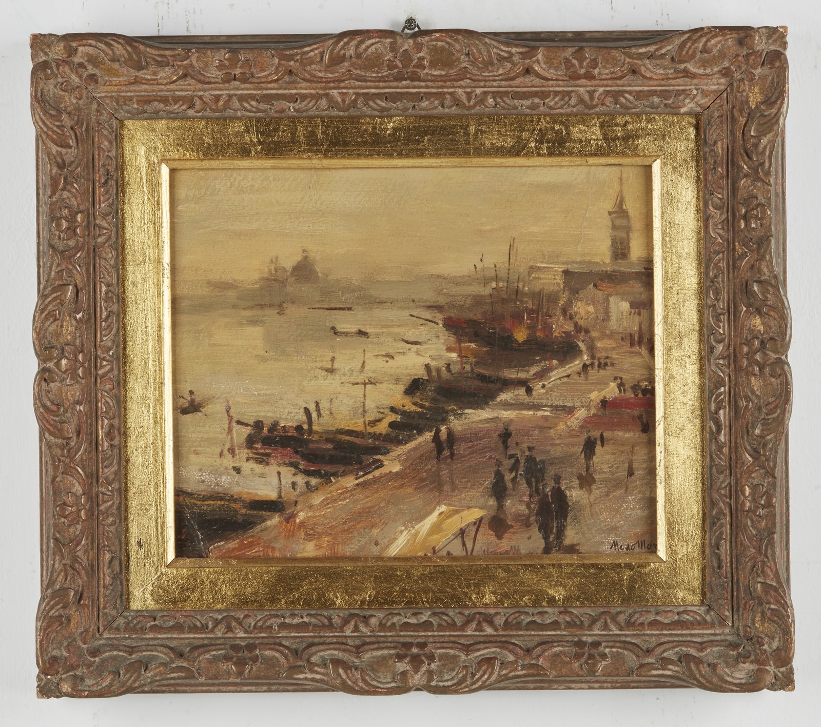 MORI NENO (1899 - 1968) Paesaggio veneziano. . Olio su cartone pressato. Cm 28,50 x 22,50. Firmato in basso a destra. . Cornice presente