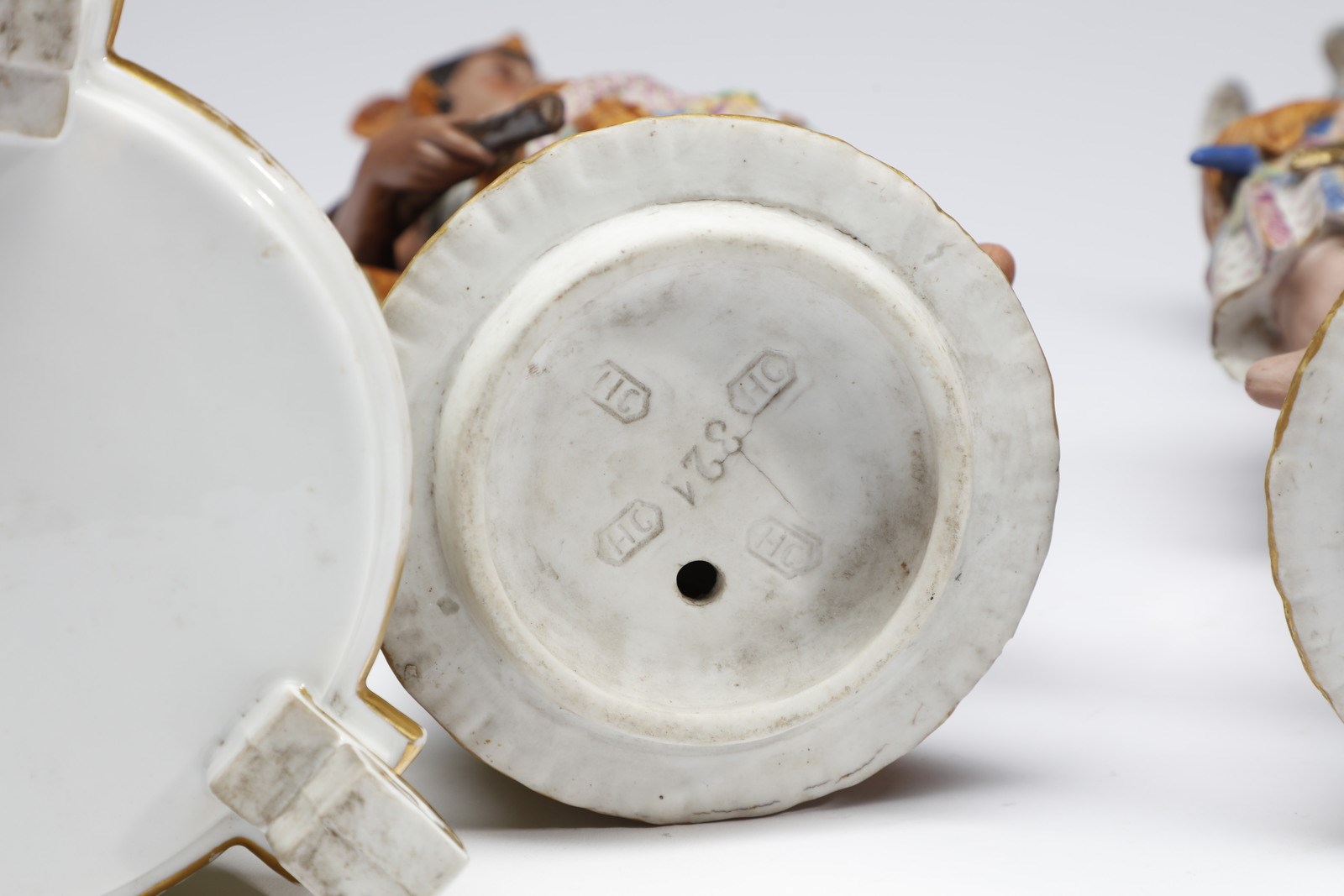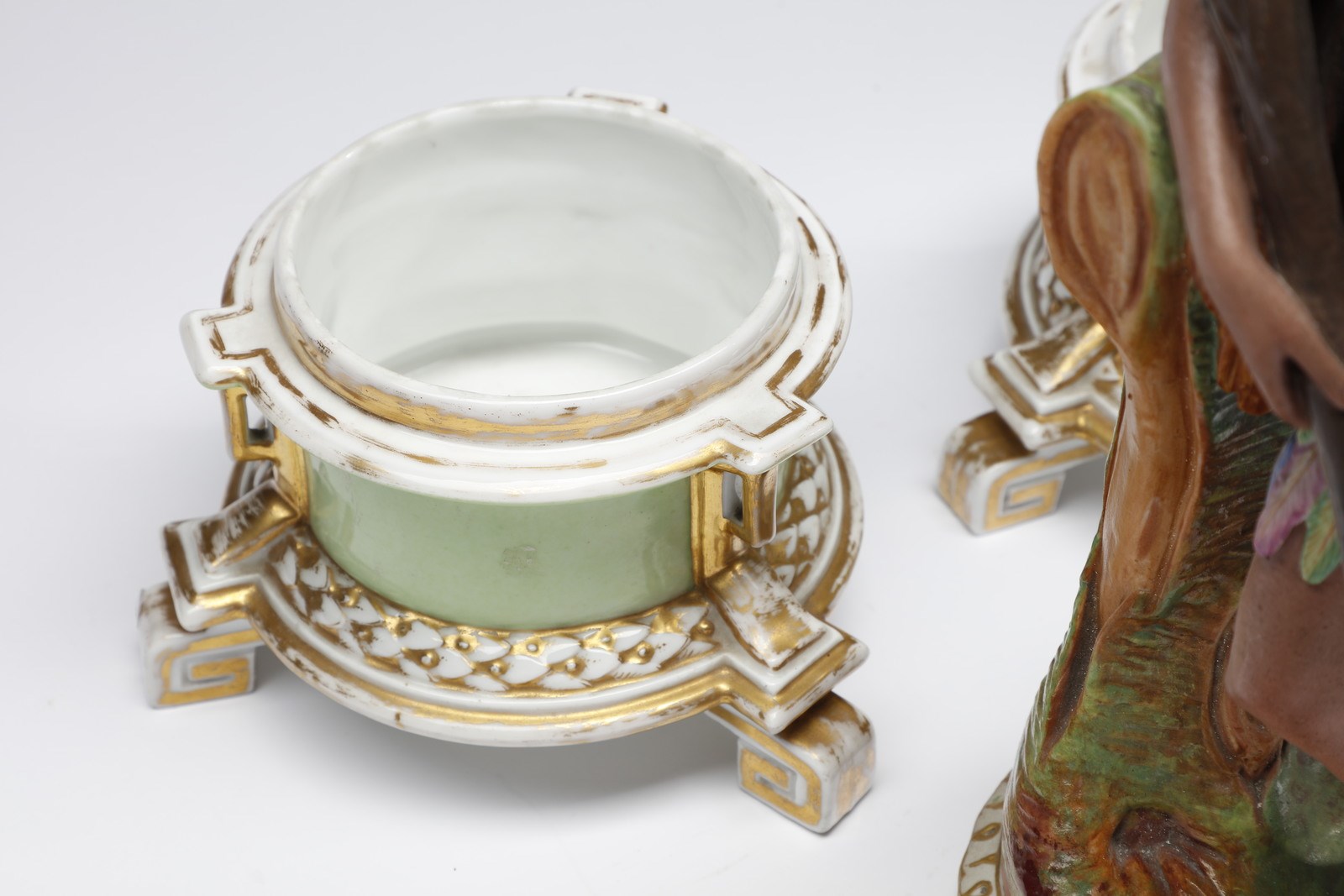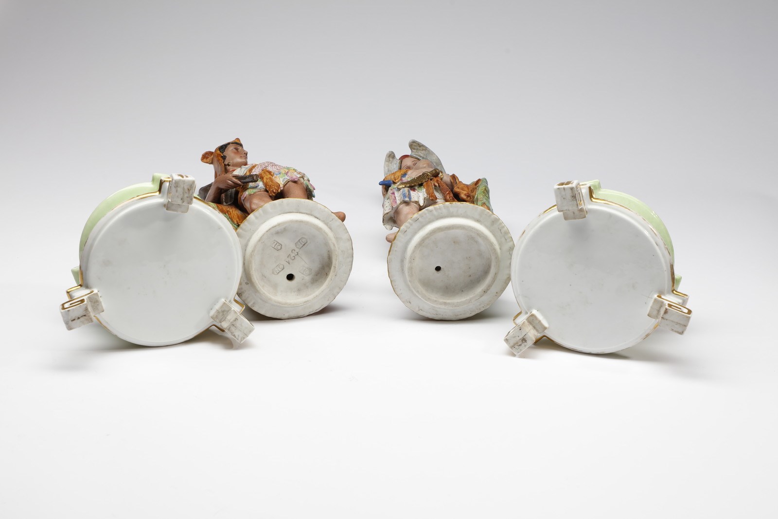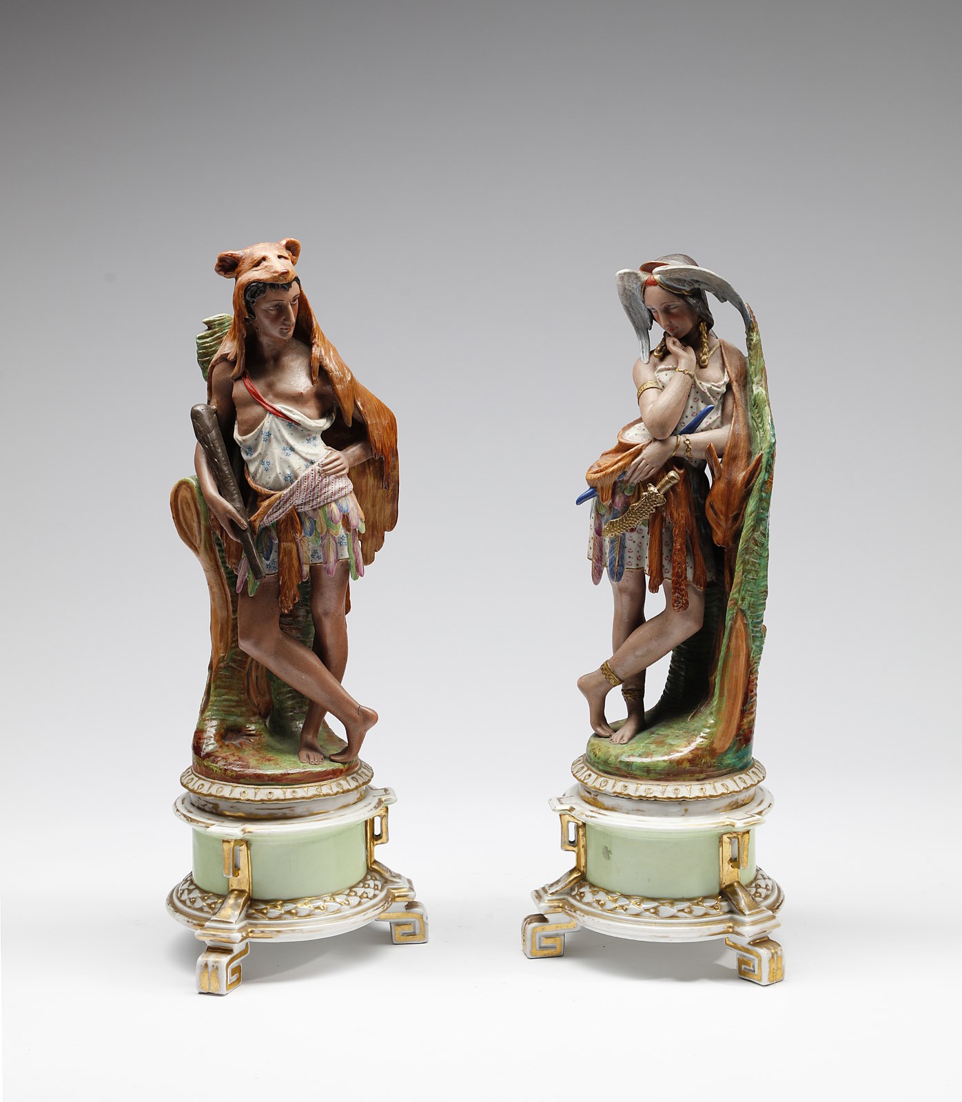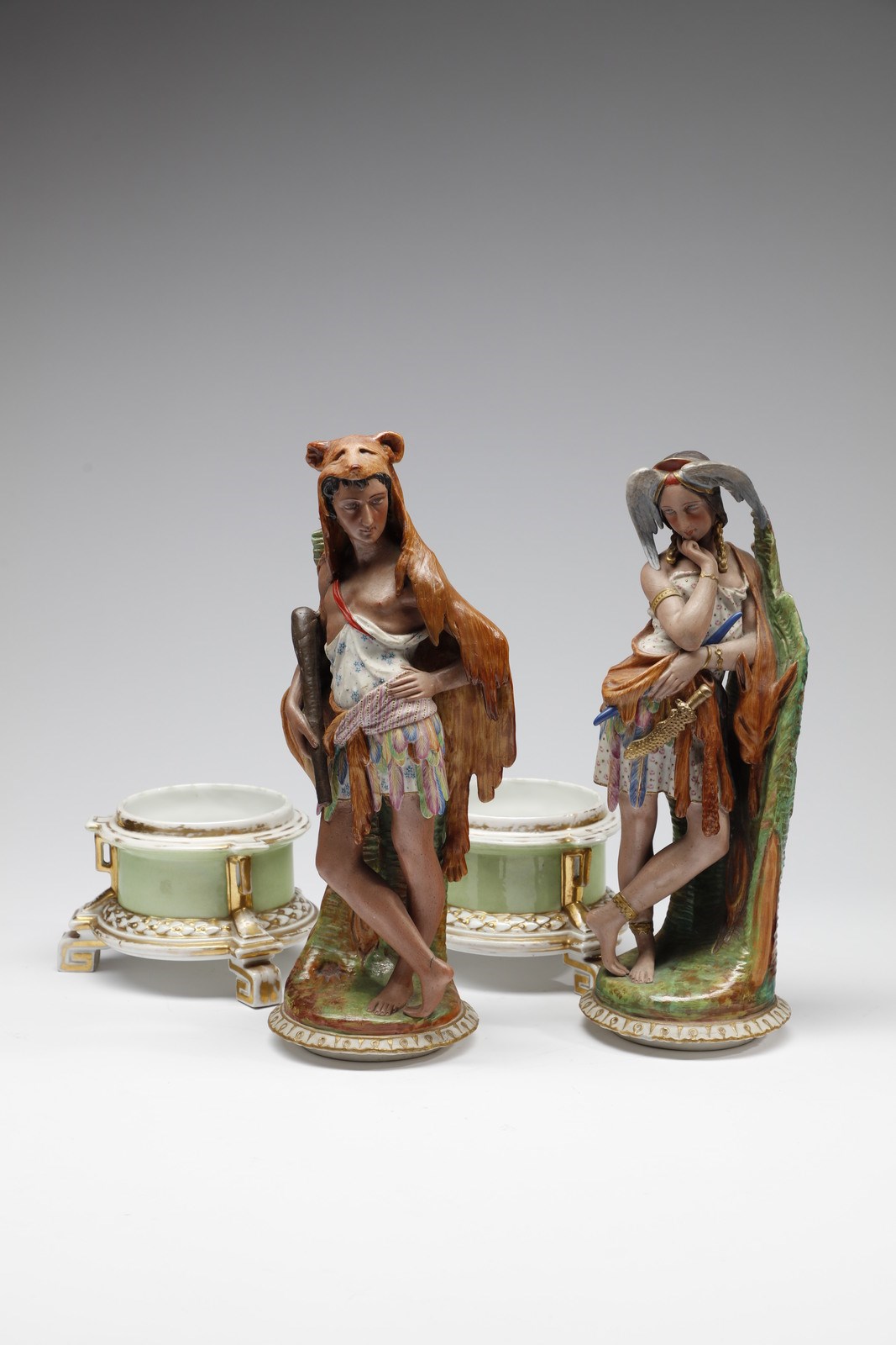 MANIFATTURA TEDESCA DEL XIX SECOLO - Coppia di figure allegoriche in terracotta e porcellana policroma. .