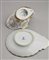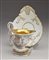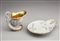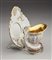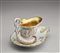 MANIFATTURA DI DRESDA DEL XIX-XX SECOLO - Tazzina in forma di elmo con piattino in porcellana dipinta e parzialmente dorata.