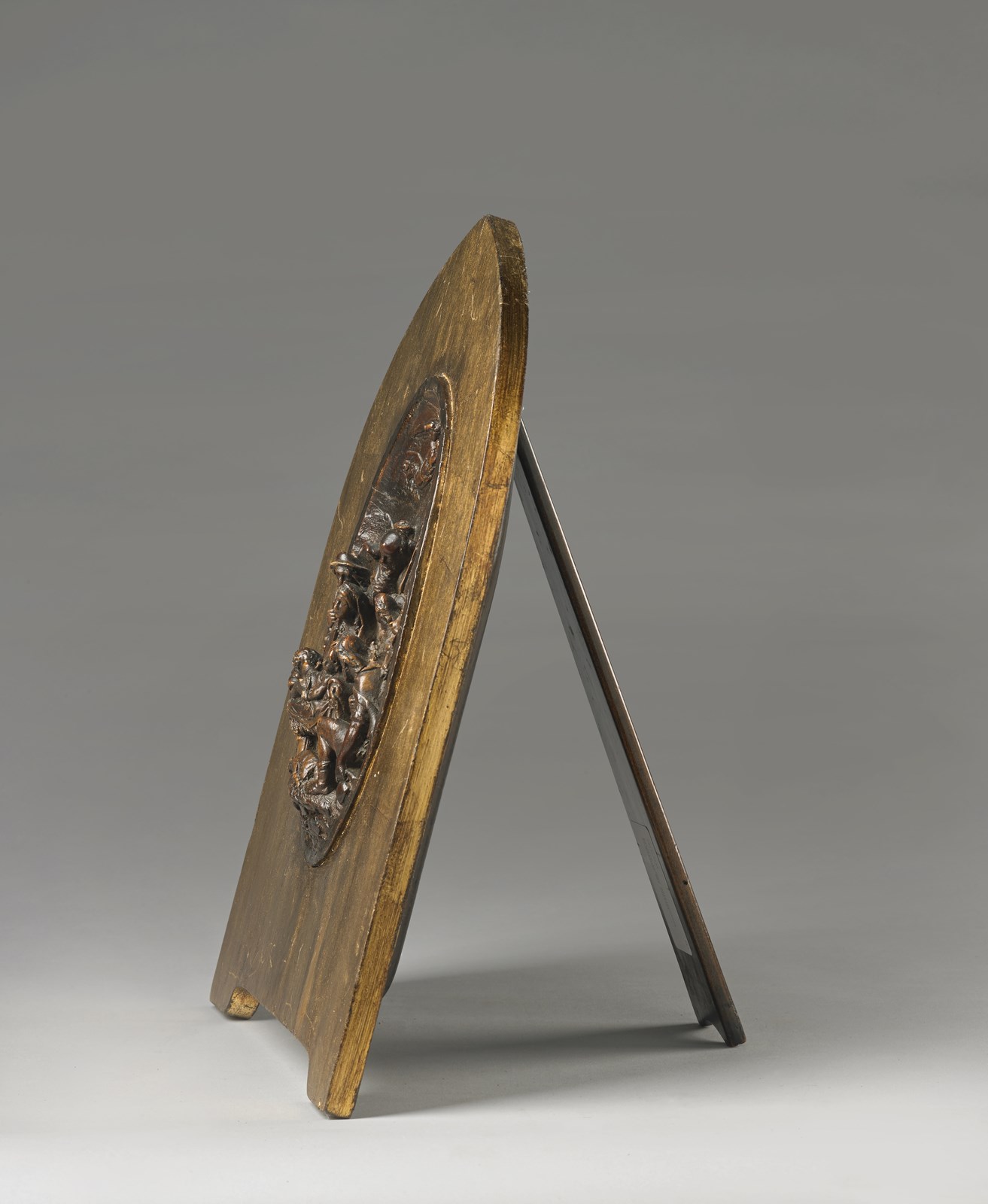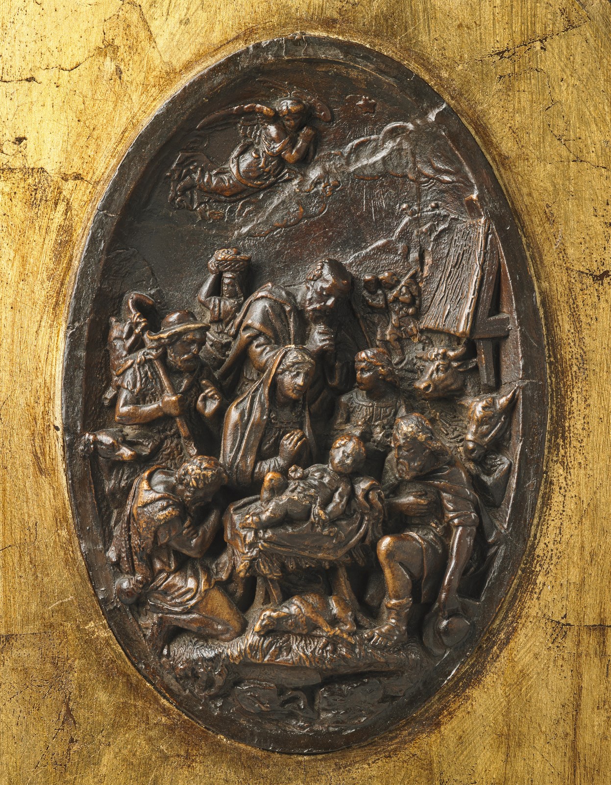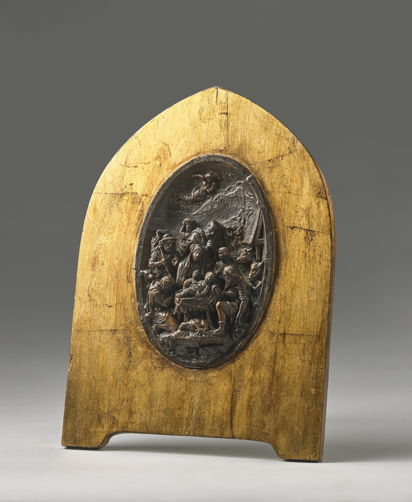 ARTISTA DELL'ITALIA SETTENTRIONALE DEL XVIII SECOLO - Pannello ovale in legno intagliato a bassorilievo raffigurante Sacra famiglia con l'adorazione dei pastori.