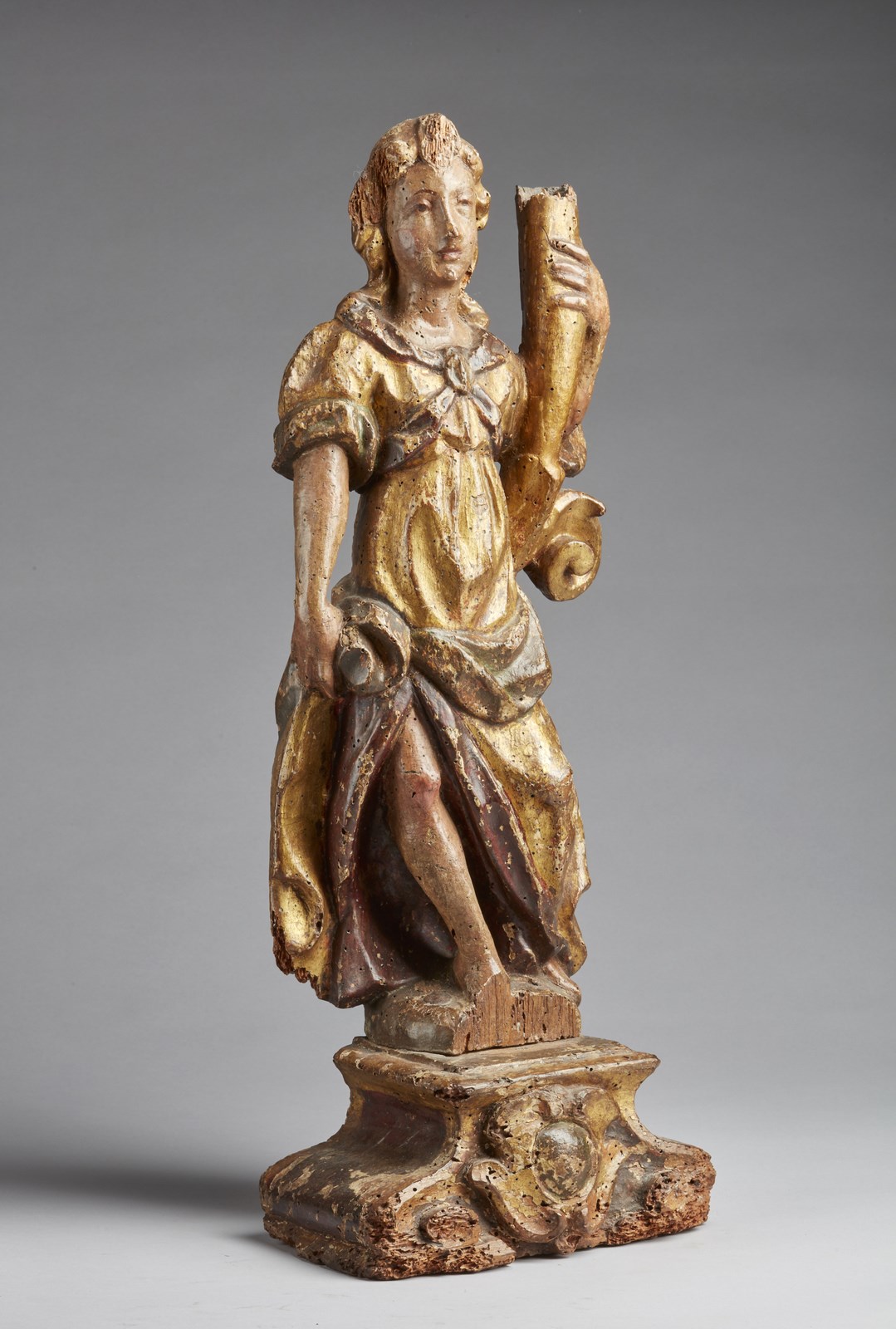 SCULTORE DELL'ITALIA SETTENTRIONALE DEL XVII SECOLO Scultura in legno policromo e parzialmente dorato raffigurante figura con cornucopia. . Cm 20,00 x 53,00 x 12,50. Difetti e mancanze.