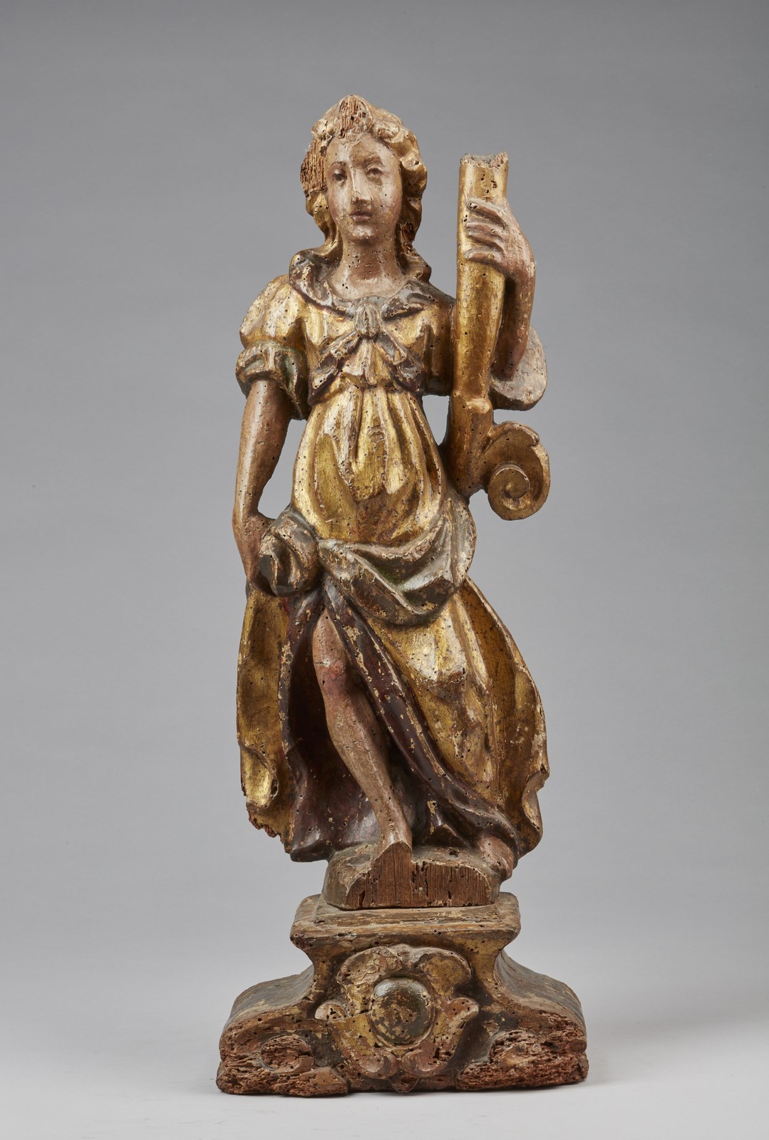 SCULTORE DELL'ITALIA SETTENTRIONALE DEL XVII SECOLO - Scultura in legno policromo e parzialmente dorato raffigurante figura con cornucopia.