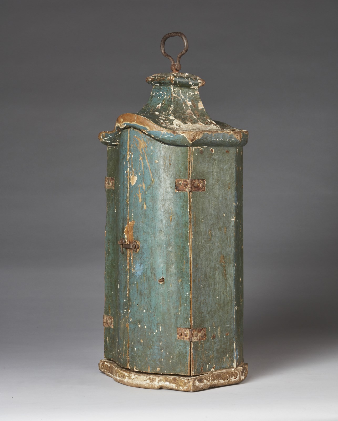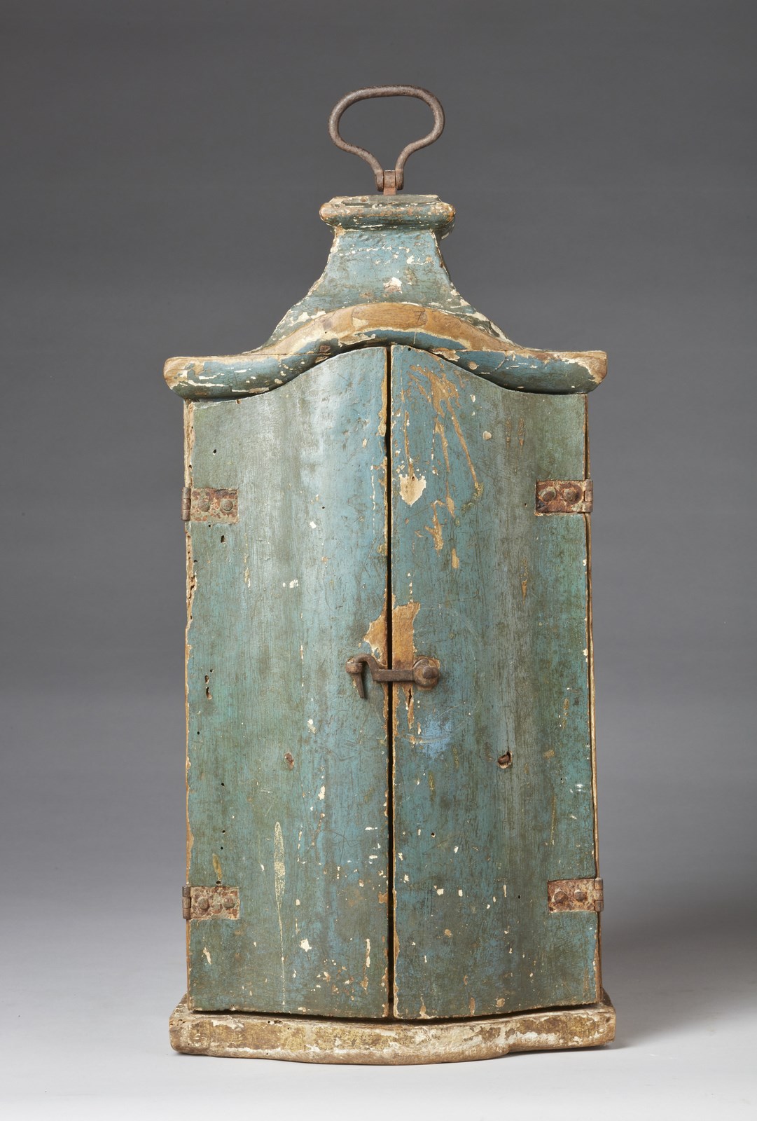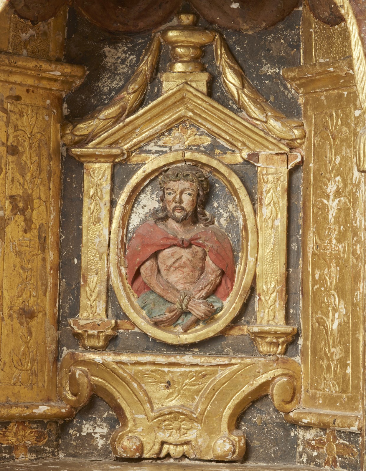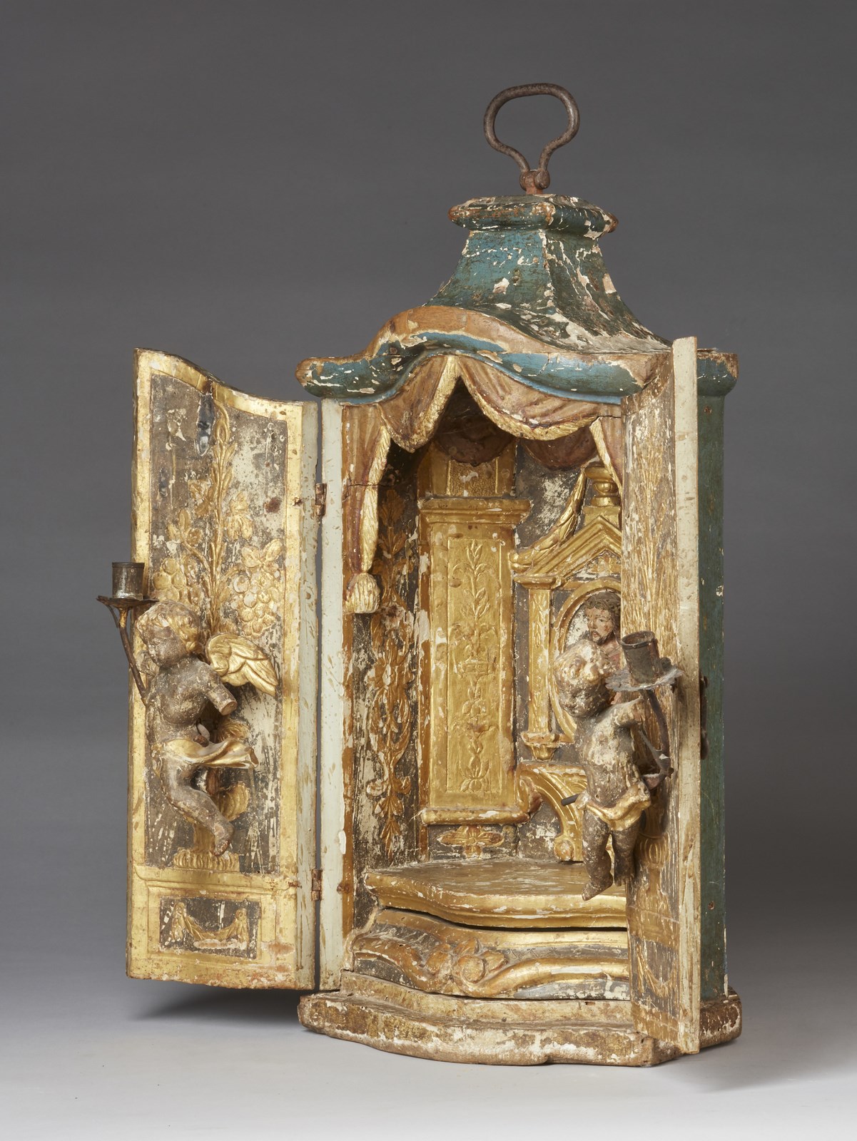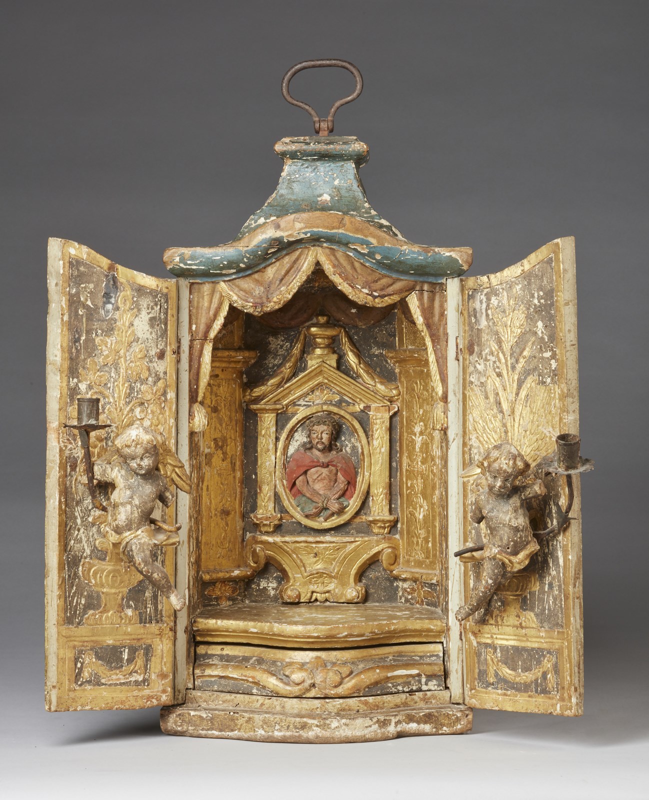 MANIFATTURA ITALIANA DEL XVIII SECOLO - Tabernacolo a due ante in legno scolpito, parzialmente dorato e dipinto.