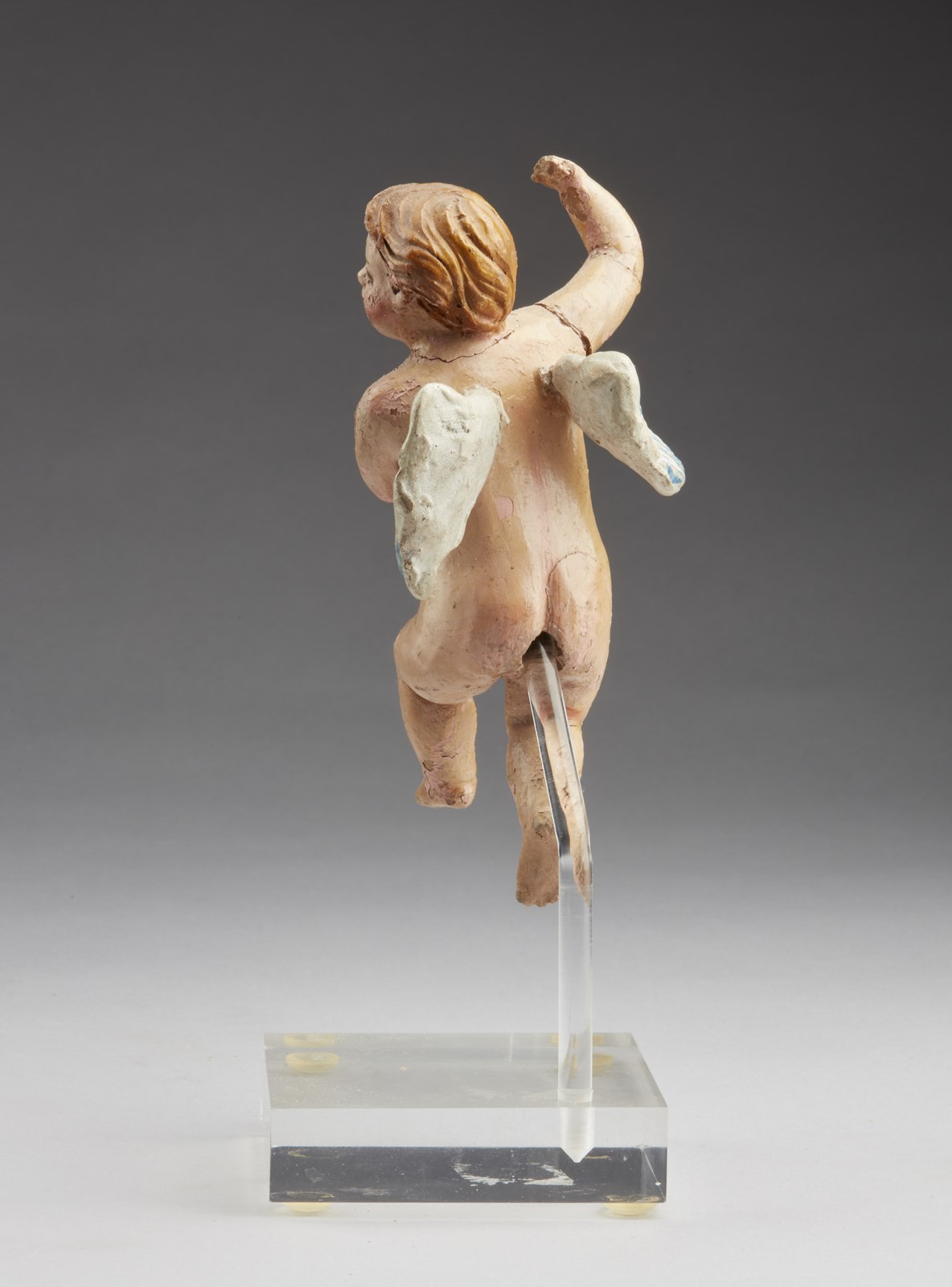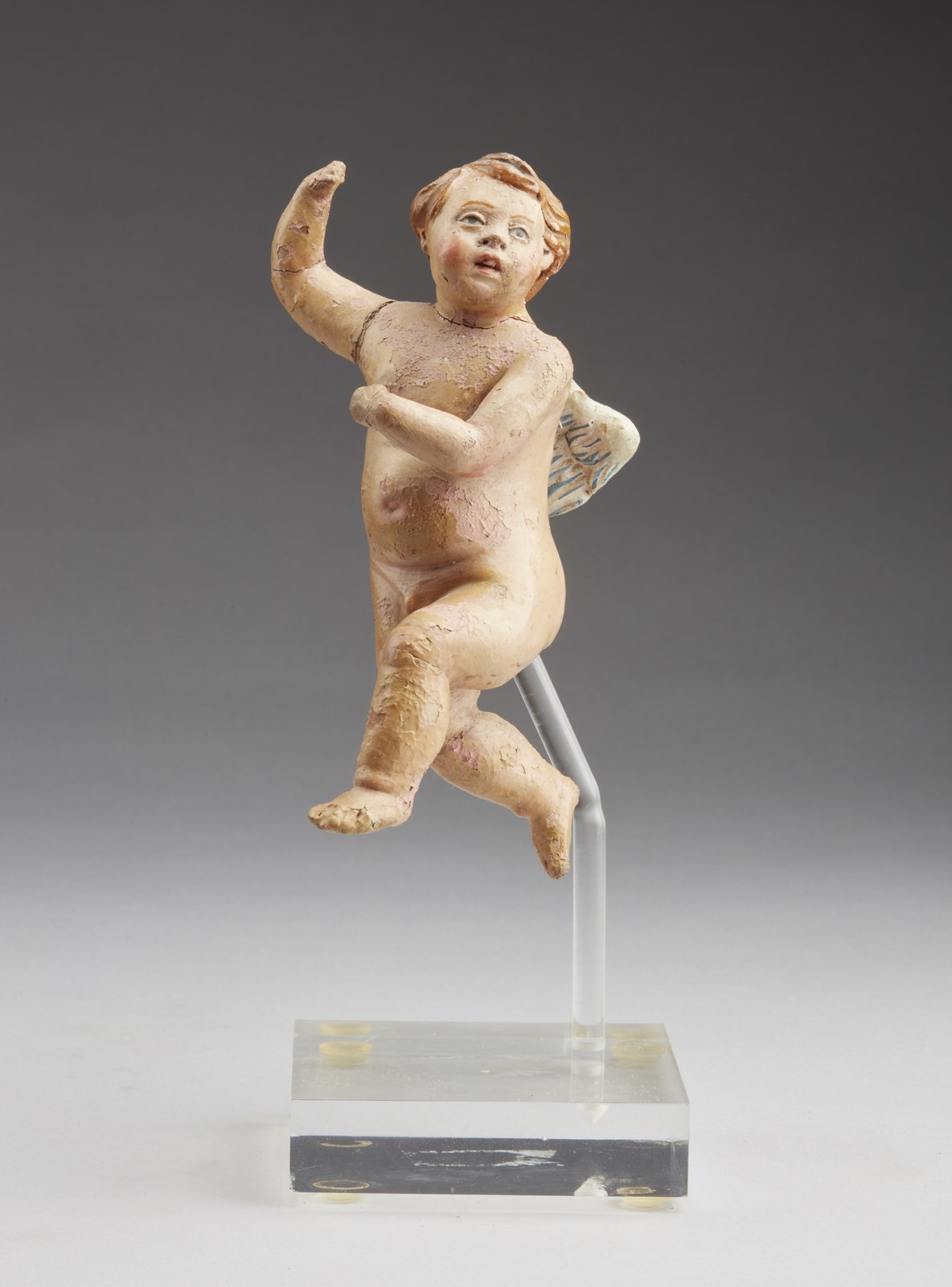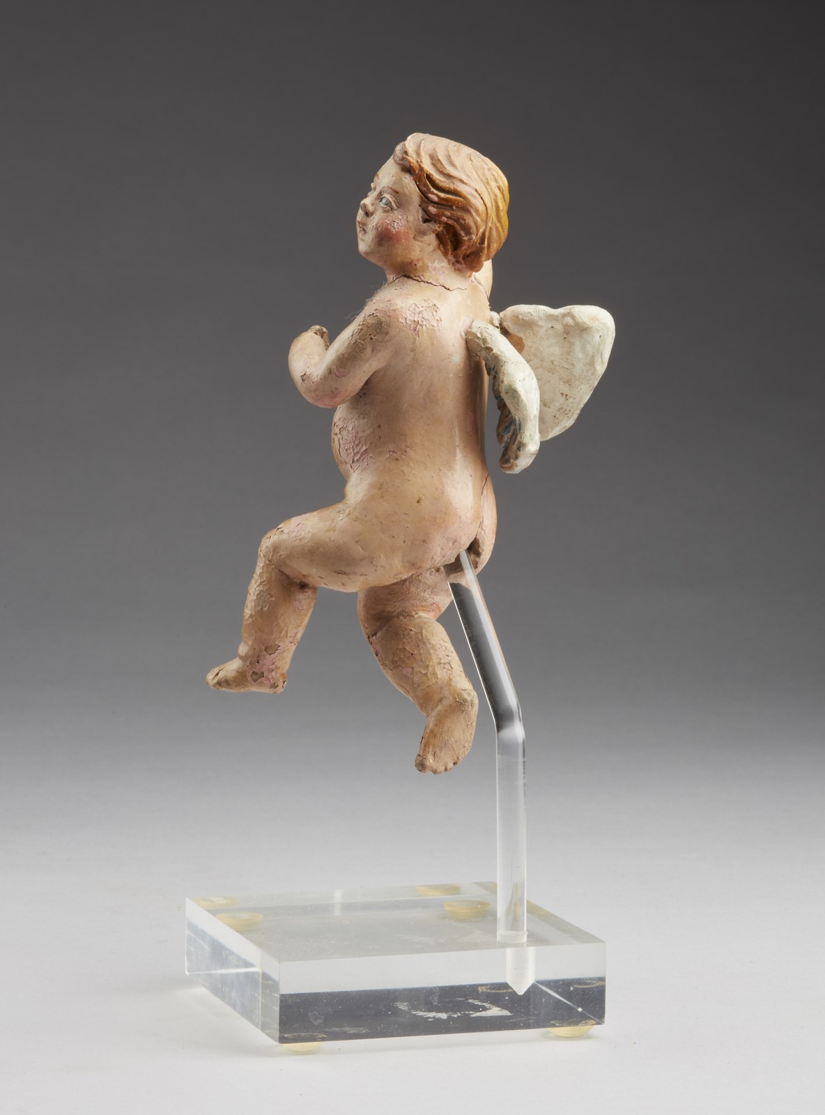 PLASTICATORE ITALIANO DEL XVIII SECOLO Angioletto in terracotta policroma. . Cm 6,00 x 13,00. Su base in plexiglass (7x7 cm). Mancanze e rotture.